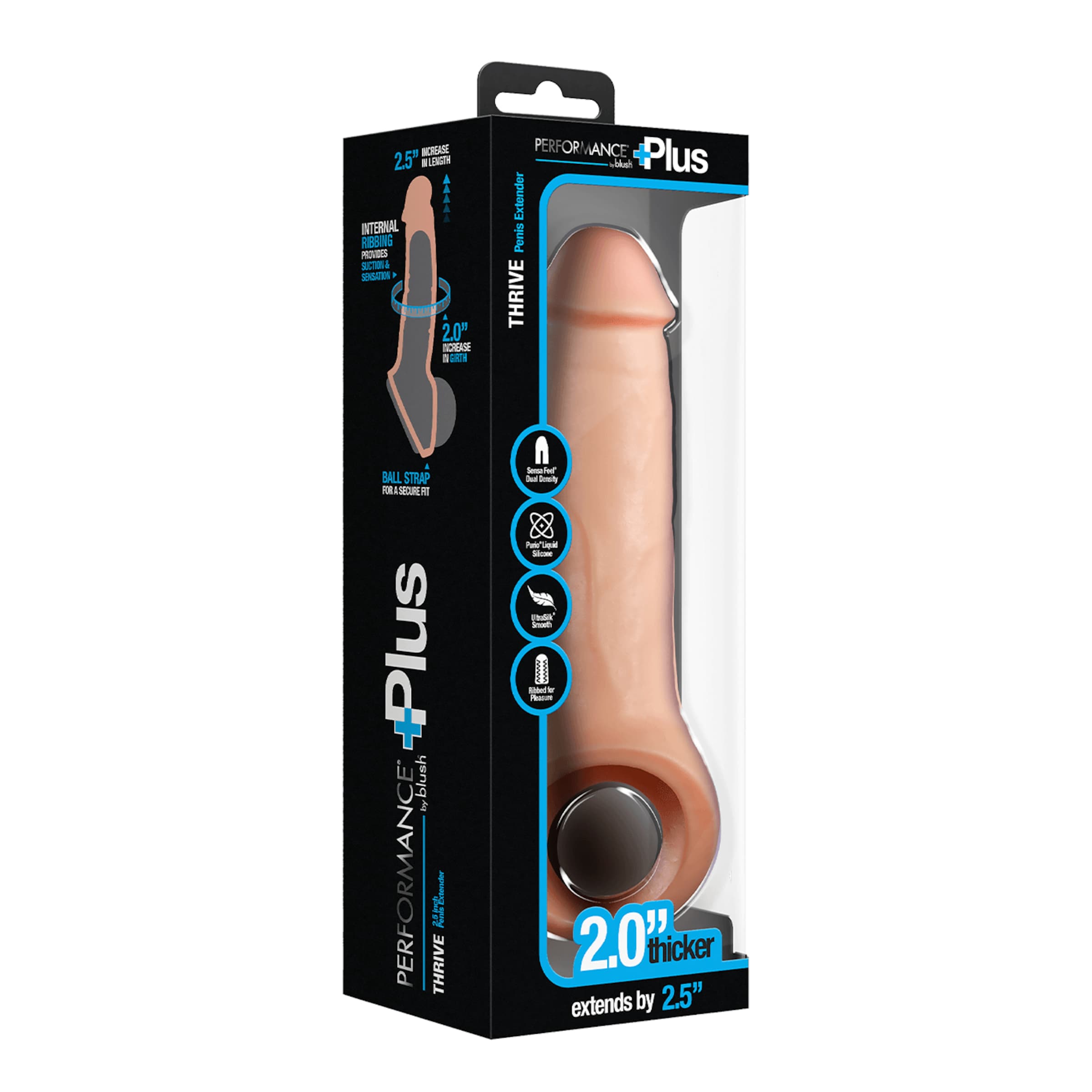 Der Thrive 2.5 Inch Silicone Penis Xtender aus der Performance Plus Kollektion von Blush Novelties ist die ideale Wahl für alle, die mehr wollen: mehr Länge, mehr Umfang, mehr Intensität. Mit einer Gesamtlänge von 22,2 cm und 5 cm im Umfang sorgt der Thrive Xtender für ein imposantes Upgrade im Schlafzimmer. Das Geheimnis seines realistischen Gefühls liegt in der Sensa Feel® Dual Density Technologie: außen weich und hautähnlich, innen stabil und kraftvoll. Die samtige Purio® Liquid Silicone Oberfläche rundet das Gefühlserlebnis perfekt ab – 100 % körperfreundlich, hypoallergen und luxuriös.