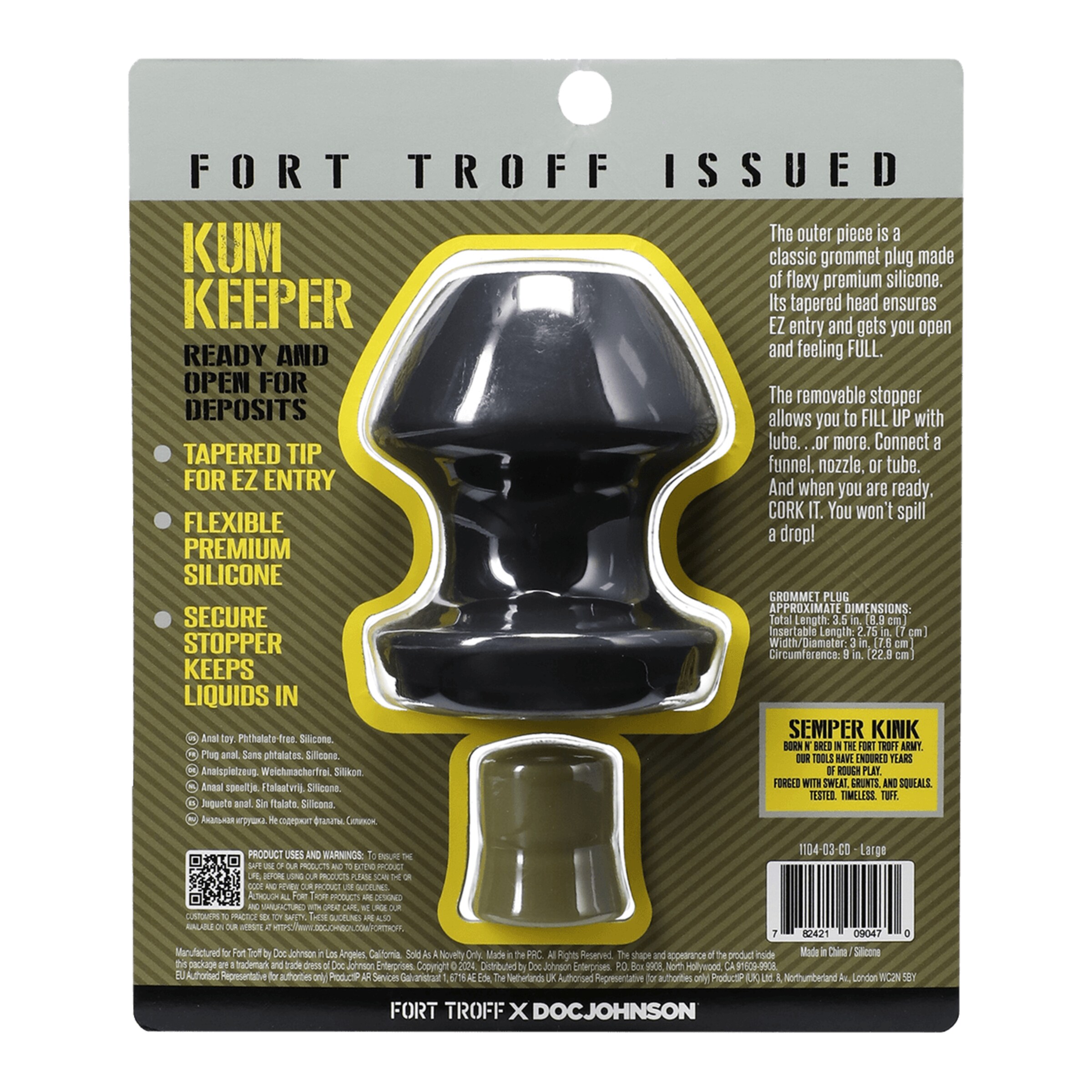 Der Kum Keeper – Large von Doc Johnson bringt Deine analen Spielchen aufs nächste Level – und zwar randvoll. Mit einer einführbaren Länge von 6,9 cm und einem massiven Durchmesser von 7,1 cm sorgt dieser Plug für ein pralles Gefühl von „voll“ – und das ist erst der Anfang! Das Besondere: Im Inneren des flexiblen Grommet-Plugs verbirgt sich ein Hohlraum, der nur darauf wartet, mit Gleitgel, Körperflüssigkeiten oder was auch immer Dich heiß macht, gefüllt zu werden. Der abnehmbare Stopfen verschließt den Inhalt zuverlässig – so bleibt alles da, wo es hingehört.