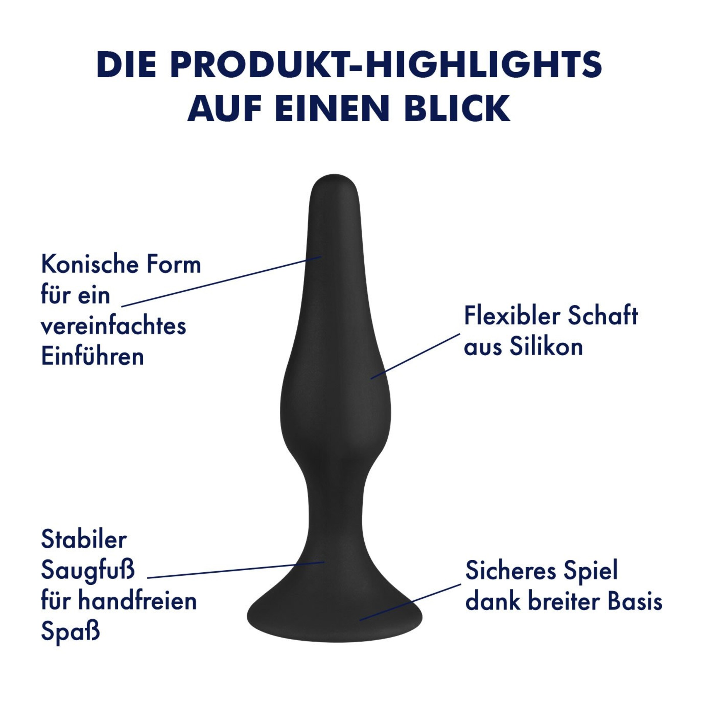 Dieser schwarze Analdildo ist ein wahrer Verführer, vor allem für die Kenner der analen Stimulation. Aus hautfreundlichem Silikon gefertigt, gehört er mit seiner konischen Form zu den zeitlosen Klassikern. Die schlanke Spitze und die leicht flexible Beschaffenheit sorgen für leichtes Einführen und machen das Handling einfach. Mit 15 cm Länge und einem Durchmesser von annähernd 4 cm ist er vor allem für diejenigen geeignet, die schon Erfahrung im Bereich Analplug mitbringen. Unten bietet die breite Basis ein sicheres Solospiel mit dem Plug und dient gleichzeitig als Saugfuß, mit dem der Dildo auf allen glatten Flächen haftet. Zum Beispiel auch an der Duschwand, wo er für ein frivoles Spielchen unter prickelndem Nass genutzt werden kann.