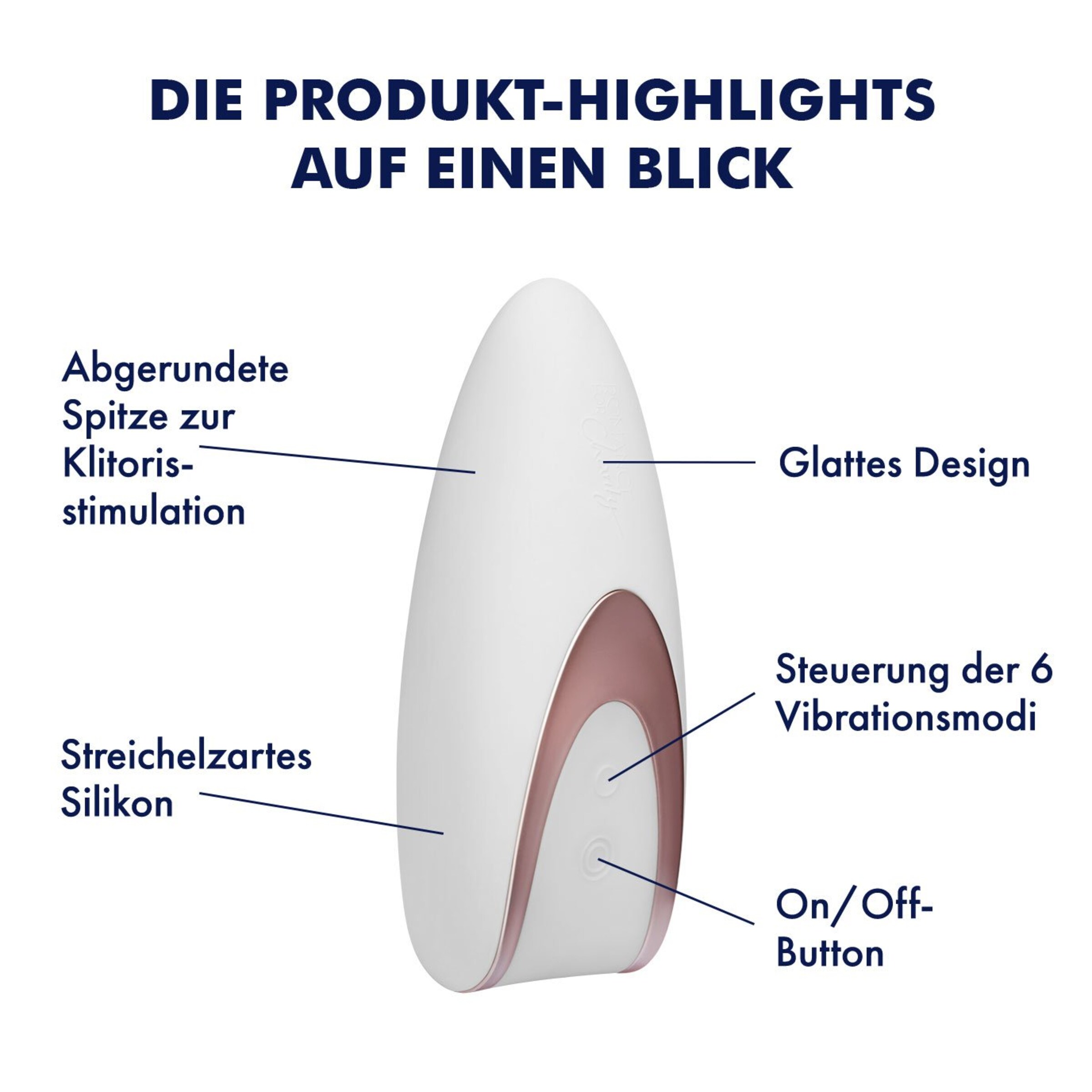 Der Vibrator in modernem Weiß liefert ein atemberaubendes Verwöhn-Programm und besteht aus hautfreundlichem Silikon und ABS mit seidig glatter Silk Touch-Oberfläche. Dadurch gleitet er besonders zärtlich über die Haut. Durch sein handliches Design liegt er optimal in der Hand und lässt sich zielgenau führen. Die schlanke Spitze massiert eindrucksvoll die Klitoris. Mit sieben vielseitigen und kraftvollen Vibrationsprogrammen sorgt der Auflegevibrator effektvoll für Höhenflüge. Sexy und luxuriös ziert eine hochglänzende Applikation in Gold die Basis des Vibrators und verleiht ihm Sexappeal.