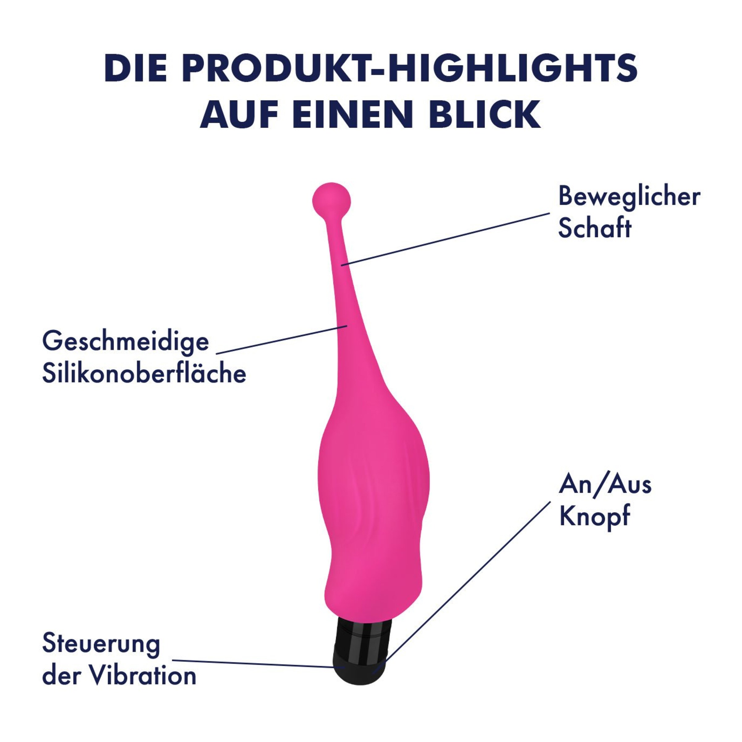Lasse Dich von der intensiven Vibration bis in den puren Wahnsinn treiben. Besonders vielseitig ist der erotische Lustbringer aufgrund seiner Biegsamkeit. Damit hast Du in allen Stellungen maximalen Spaß und kannst Deine leidenschaftliche Seite zum Vorschein bringen! Die Klitoris ist eine der erogensten Zonen einer Frau. Stimuliere Deine Liebesperle ganz einfach mit diesem Auflegevibrator und genieße die Wellen der Lust, die Dich überkommen. Dank seiner edlen, glatten Beschaffenheit wirkt der geschwungene Freudenspender besonders verheißungsvoll und betörend. Hocherotische Massagen werden mit der runden Spitze möglich. Besondere Sinnesreize verschafft Dir die angenehm glatte Struktur, die Dich an gewissen Stellen schon nach wenigen Momenten auf den nächsten Höhenflug schickt.
