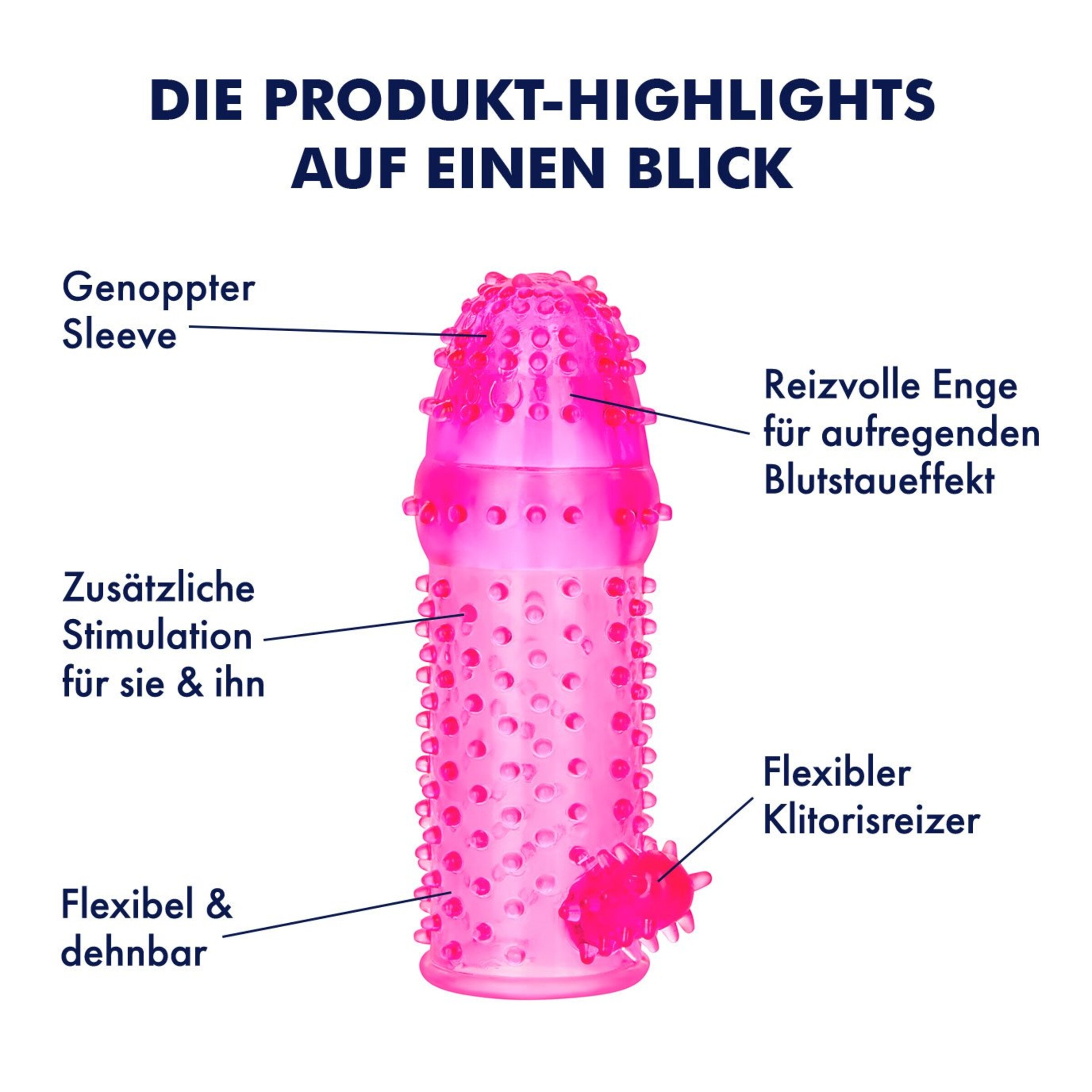 Diese pinkfarbene Penishülle ist durch ihr außergewöhnliches Design ein Must-have für innige Momente. Die Hülle wird über den Penis gezogen und stimuliert gleichzeitig beide Partner auf sehr prickelnde Weise. Durch die dehnbare und sehr anschmiegsame Beschaffenheit spürt Er die anregende Enge während des Liebesspiels. Zahlreiche weiche Noppen verteilt auf der ganzen Hülle und ein weicher Klitorisreizer stimulieren Sie dabei gleichzeitig intensiv am G-Punkt und der Klitoris. An der Spitze ist der Sleeve geschlossen. Für ein aufregendes und intensives Liebesspiel!