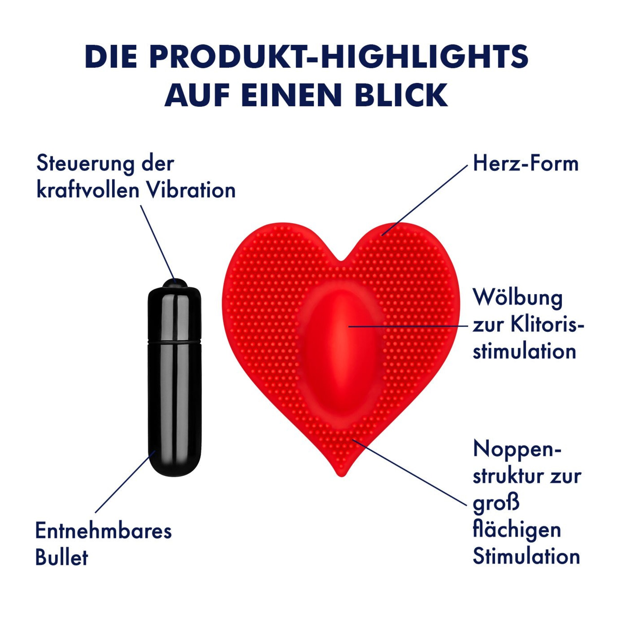 Das weiche, biegsame Silikon ist wunderbar geschmeidig, sodass die beiden seitlichen Rundungen des Herzens sich Deinen Schamlippen gekonnt anschmiegen und sie mit den vielzähligen, kleinen Noppen auf ihrer Innenseite prickelnd massieren. In der Mitte befindet sich eine glatte, gewölbte Erhebung, mit der Du zwischen Klitoris und Lustpforte auf- und abgleiten kannst. Dabei sorgt die zusätzliche Vibration auf Knopfdruck dafür, dass sich Dein Puls verschnellert - Orgasmen nach Herzenslust sind die Folge! In Kombination mit einem wasserbasierten Gleitmittel wird dieser handliche Lustbringer Dir unvergessliche, intensive Gefühlserlebnisse bescheren und begleitet Dich dank wasserdichter Verarbeitung sogar unter die Dusche. Und damit Du direkt loslegen kannst, sind die Batterien bereits im Lieferumfang enthalten.