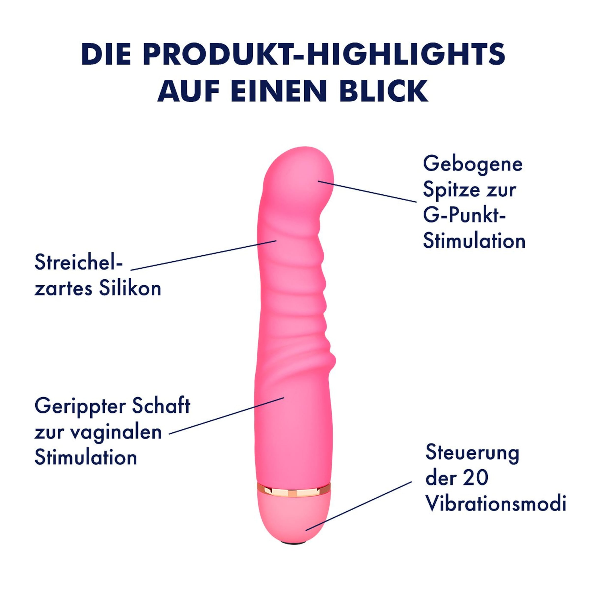 Dieser G-Punkt-Vibrator verwöhnt Dich wie kein anderer. Der Schaft aus hautfreundlichem Silikon bietet Dir eine angenehm weiche und samtige Haptik. Die sanften Rippen auf der Innenseite massieren und stimulieren Deine Liebeshöhle intensiv. Die gebogene Spitze bringt Deinen G-Punkt auf Touren und sorgt für noch intensivere Höhepunkte. Die intensive Vibration in 20 abwechslungsreichen Rhythmen bietet Dir zudem erotische Abwechslung, so dass es auf Deiner sexuellen Spielwiese nie langweilig wird.