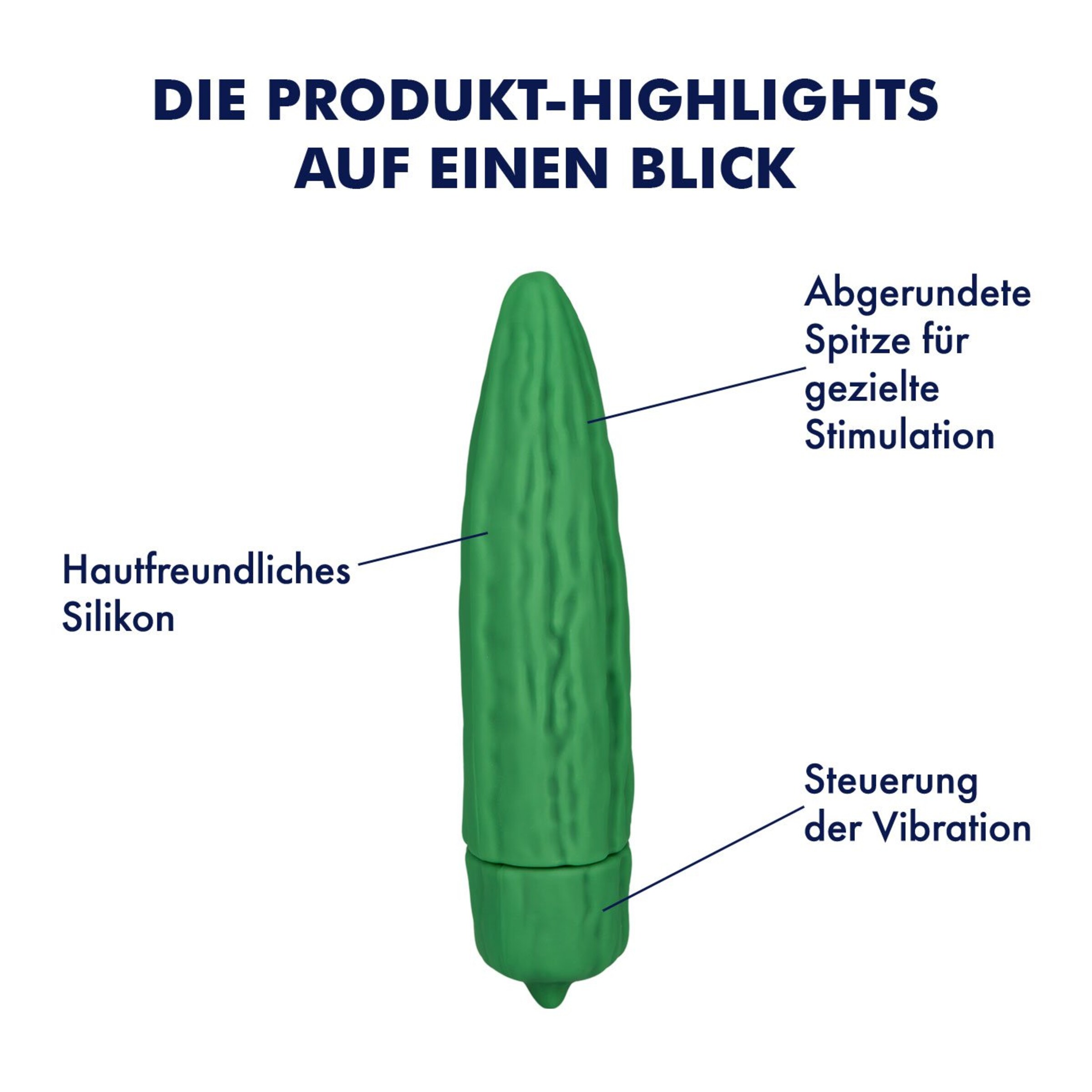Nimm Dir diesen Minivibrator und erlebe klitorale Orgasmen der besonderen Art: dank der zahlreichen Nervenenden in diesem Bereich so intensiv wie an kaum einer anderen Stelle! Besonders anregend: Dieses Toy kommt im ansprechend diskreten Gurken-Design daher.