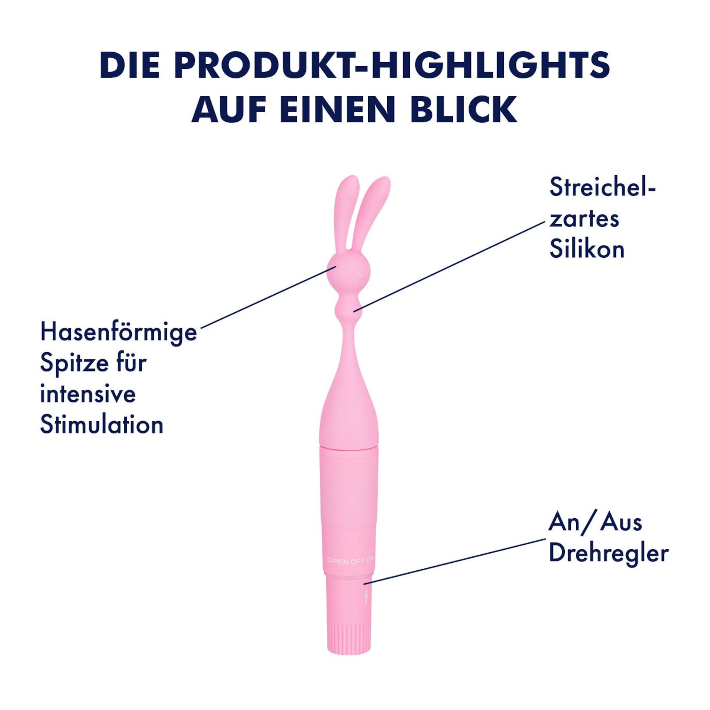 Lass Dich von der intensiven Vibration bis in den puren Wahnsinn treiben. Für Vielseitigkeit in der Anwendung ist gesorgt: Die Biegsamkeit des Lustbringers wird Dir in allen Stellungen Freude bereiten. Leb Deine Fantasien hemmungslos aus! Die Klitoris ist eine der erogensten Zonen einer Frau. Massiere Deine Liebesperle ganz einfach mit diesem Auflegevibrator und genieße die Wellen der Lust, die Dich überkommen. Der hasenförmige Klitorisreizer massiert Deine erogenste Zone und treibt Dich mit seiner glatten Oberfläche zur puren Ekstase. Erlebe umwerfende Liebkosungen Deiner Liebesperle, die Dich in den puren Wahnsinn treiben werden!