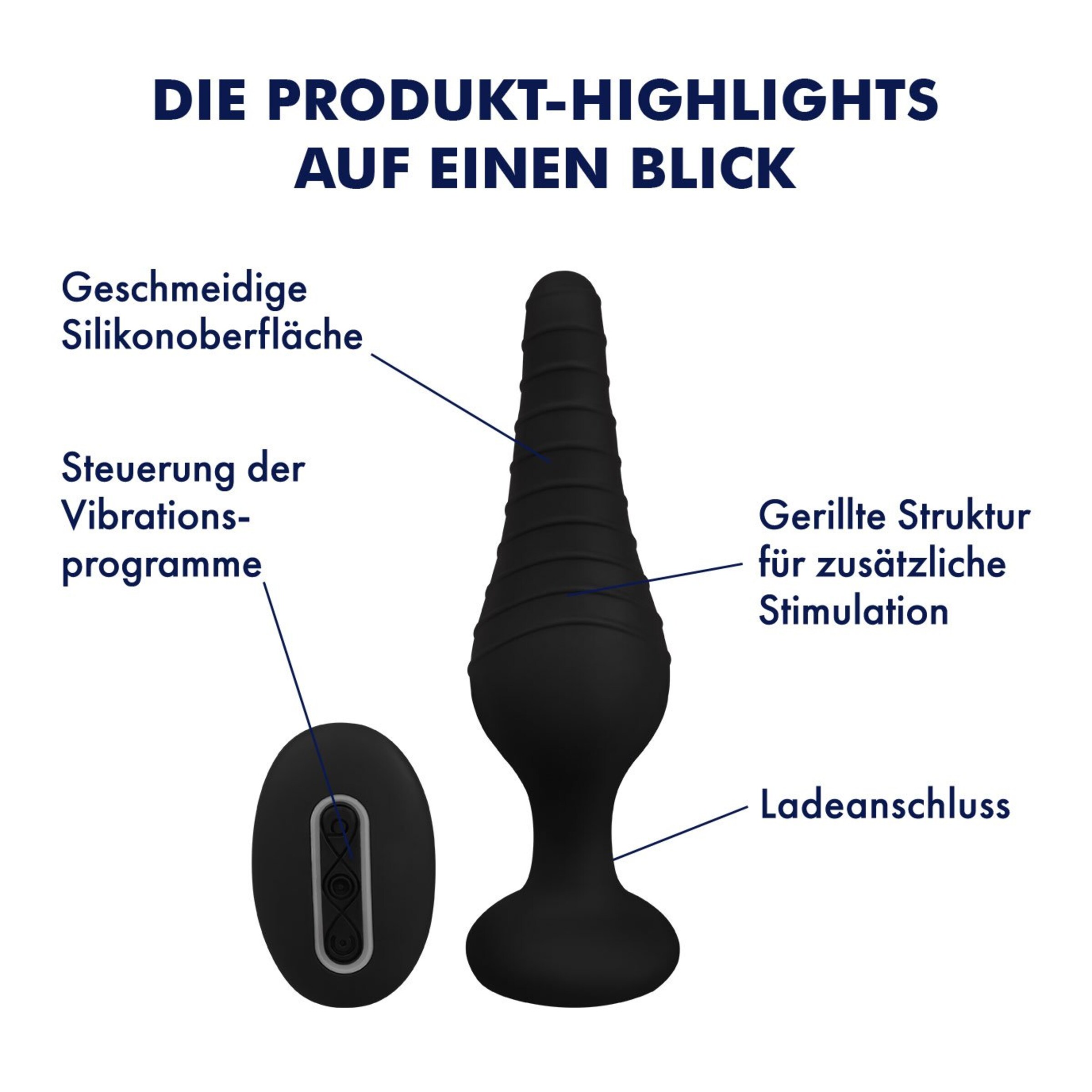 Lasse Dich von dem kraftvollen Motor in 10 unterschiedlichen Vibrationsprogrammen verwöhnen. Von zärtlich bis intensiv: Entscheide selbst, wie Du es am meisten genießt. Für Vielseitigkeit in der Anwendung ist gesorgt: Die Biegsamkeit des Freudenspenders wird Dir in allen Stellungen Freude bereiten. Leb Deine Fantasien hemmungslos aus! Dank Funkfernbedienung kannst Du Dein Sextoy völlig unkompliziert bedienen - und das erotische Verwöhnprogramm umso mehr genießen. Dieser Analvibrator ist ein Must-Have für Freunde analer Vergnügungen, ganz egal, ob er alleine zum Einsatz kommt oder das gemeinsame Liebesspiel mit dem Partner aufpeppt. Für sichere Action mit Deinem Lustbringer sorgt die breite Basis. Genieße die Befriedigung völlig sorglos und verliere Dich in einem leidenschaftlichen Rhythmus der Lust, den Du fast wie beim echten Sex mit Deinem Körper selbst bestimmst. Die gerade Ausführung lässt Dein Lieblingstoy nicht nur schön aussehen, sondern es wickelt Dich zudem mit seinen sexy Rillen auch zielsicher um den Finger. Für berauschende Höhepunkte stimuliert Dich die schmale Spitze, die Dich durch die Rillen noch zusätzlich stimuliert.