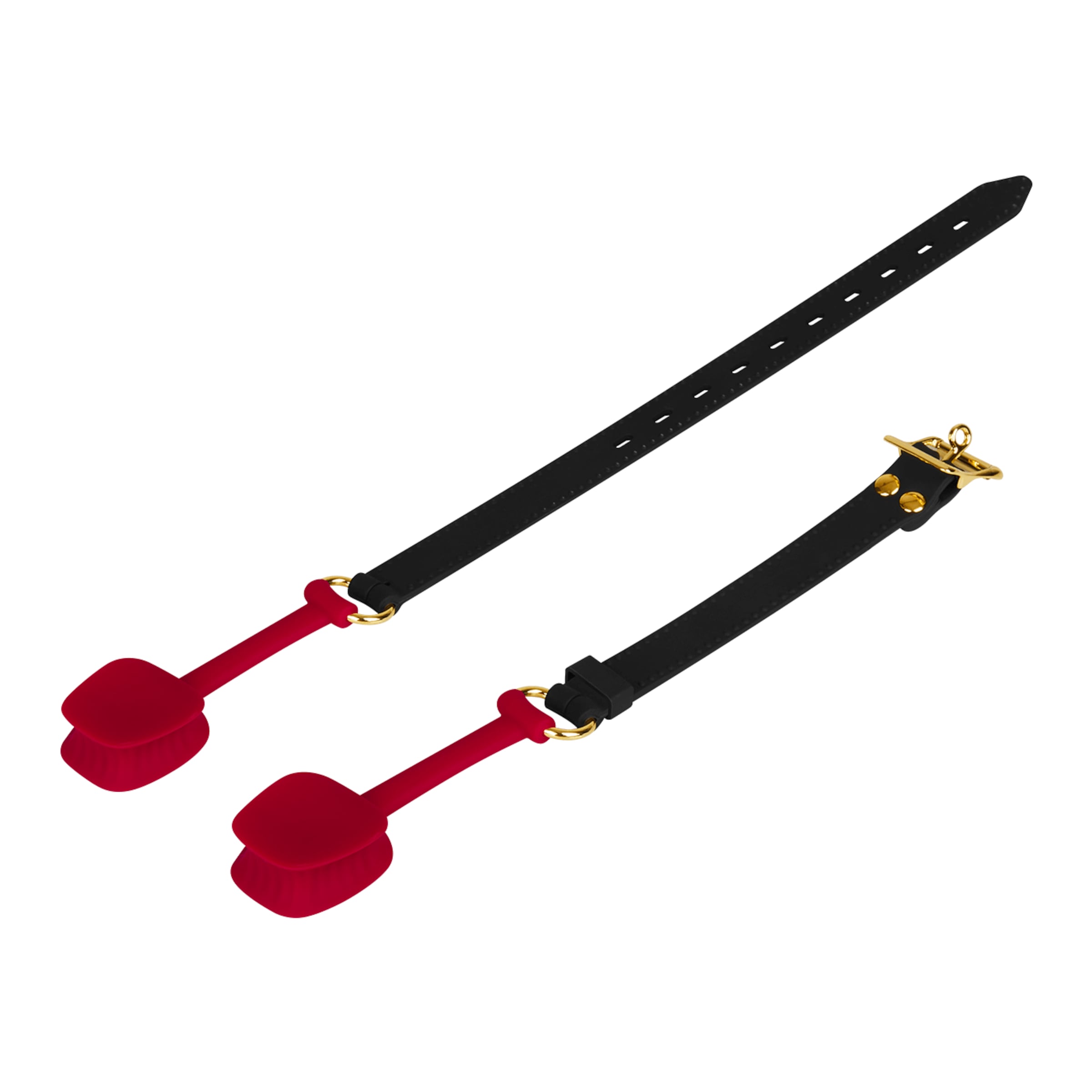 Die Knebelkomponente besteht aus zwei roten Silikonteilen, die zwischen die Zähne geklemmt werden. Dadurch wird der Mund weit aufgespreizt und eröffnet ungeahnte Möglichkeiten der Lust. Tauche ein in die Welt der Unterwerfung und lasse Dich von der ekstatischen Macht der Unterwerfung verzaubern.