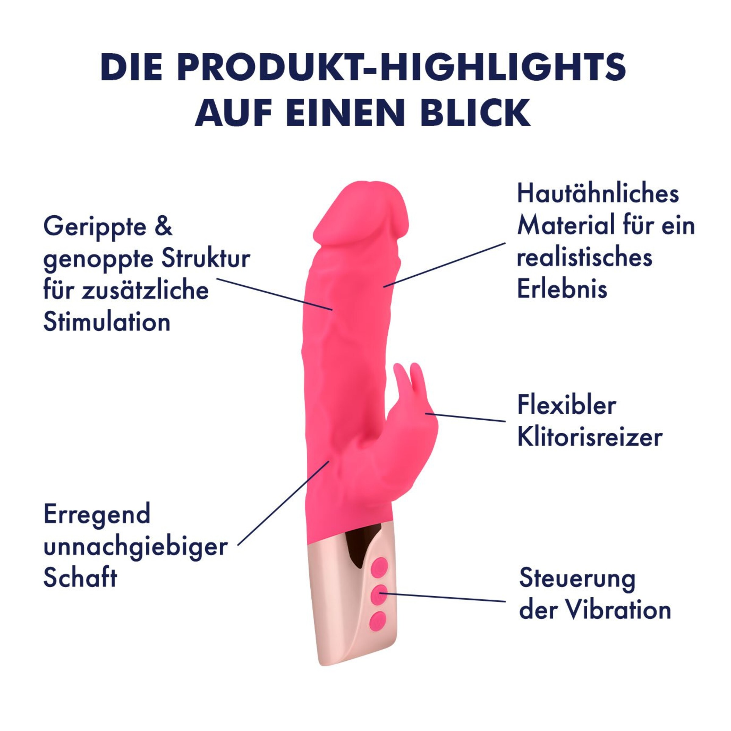 Dieses Meisterwerk von EIS bringt Deine Fantasien zum Glühen! Der Naturnahe Rabbitvibrator aus hochwertigem Silikon und ABS-Kunststoff vereint realistische Form und aufregende Power in einem unwiderstehlichen Design. Mit einer einführbaren Länge von 11 cm und einem Durchmesser von 4,3 cm, passt sich dieser Vibrator perfekt an und verspricht mit jeder Berührung sinnliche Momente voller Hingabe. Die neon-pinke Oberfläche und das goldene Bedienelement verleihen ihm einen stilvollen Look – ein Anblick, der Dich sofort in seinen Bann zieht.