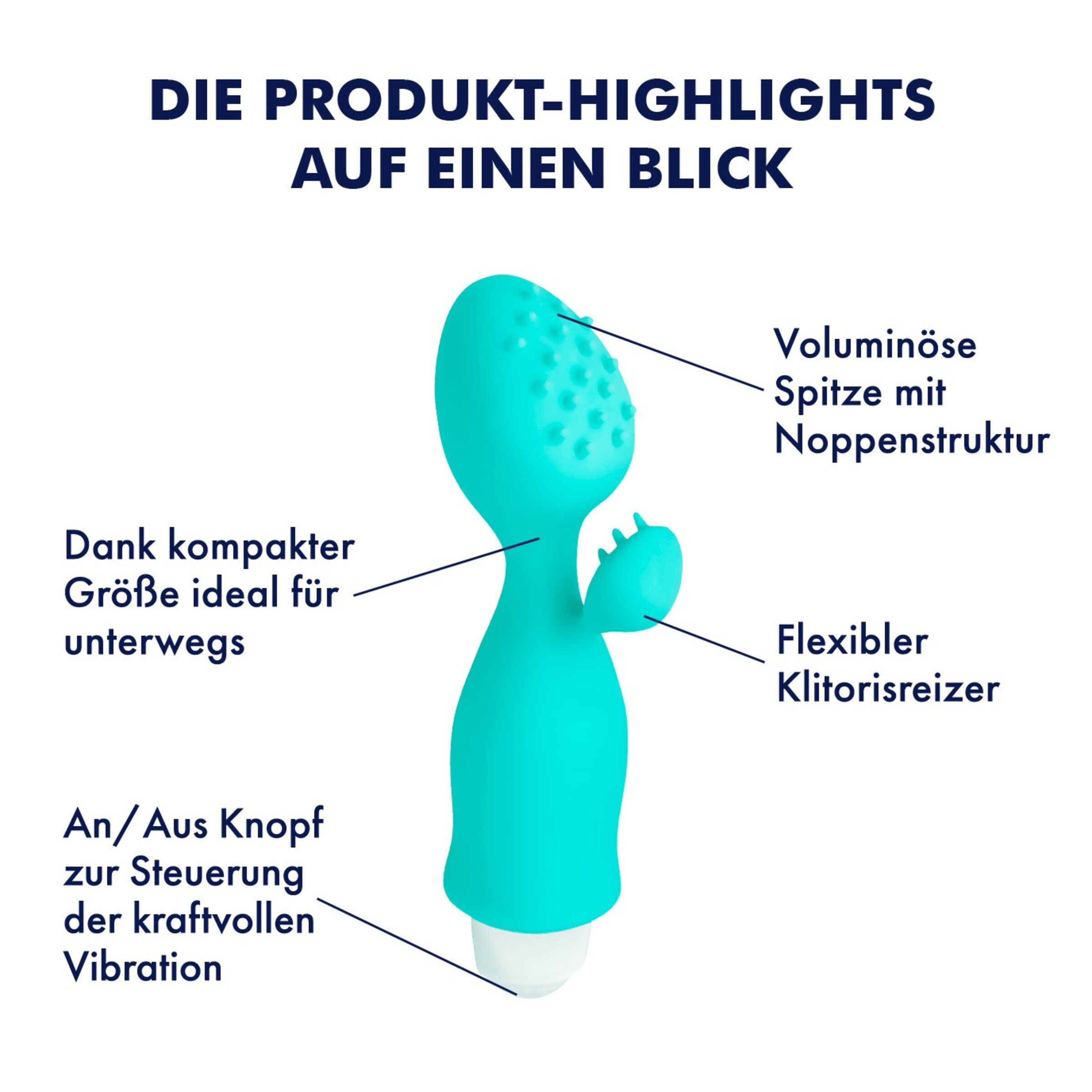 Der dezente Vibrator in verträumtem Türkis gleitet durch seine samtig-weiche Oberfläche fast wie von selbst, was besonders Anfänger freuen wird. Die reizenden Noppen massieren aufregend und bereiten Dir garantiert sinnliche Höhepunkte. Ob Du ihn einführst oder zur Klitoris-Stimulation nutzt, ist ganz Dir überlassen. Der Kleine findet jedenfalls alle Deine empfindlichsten Stellen und steht allzeit bereit Dich zu verführen. Die kraftvolle Vibration kannst Du ganz einfach über den Knopf an der Basis des Freudenspenders bedienen.
