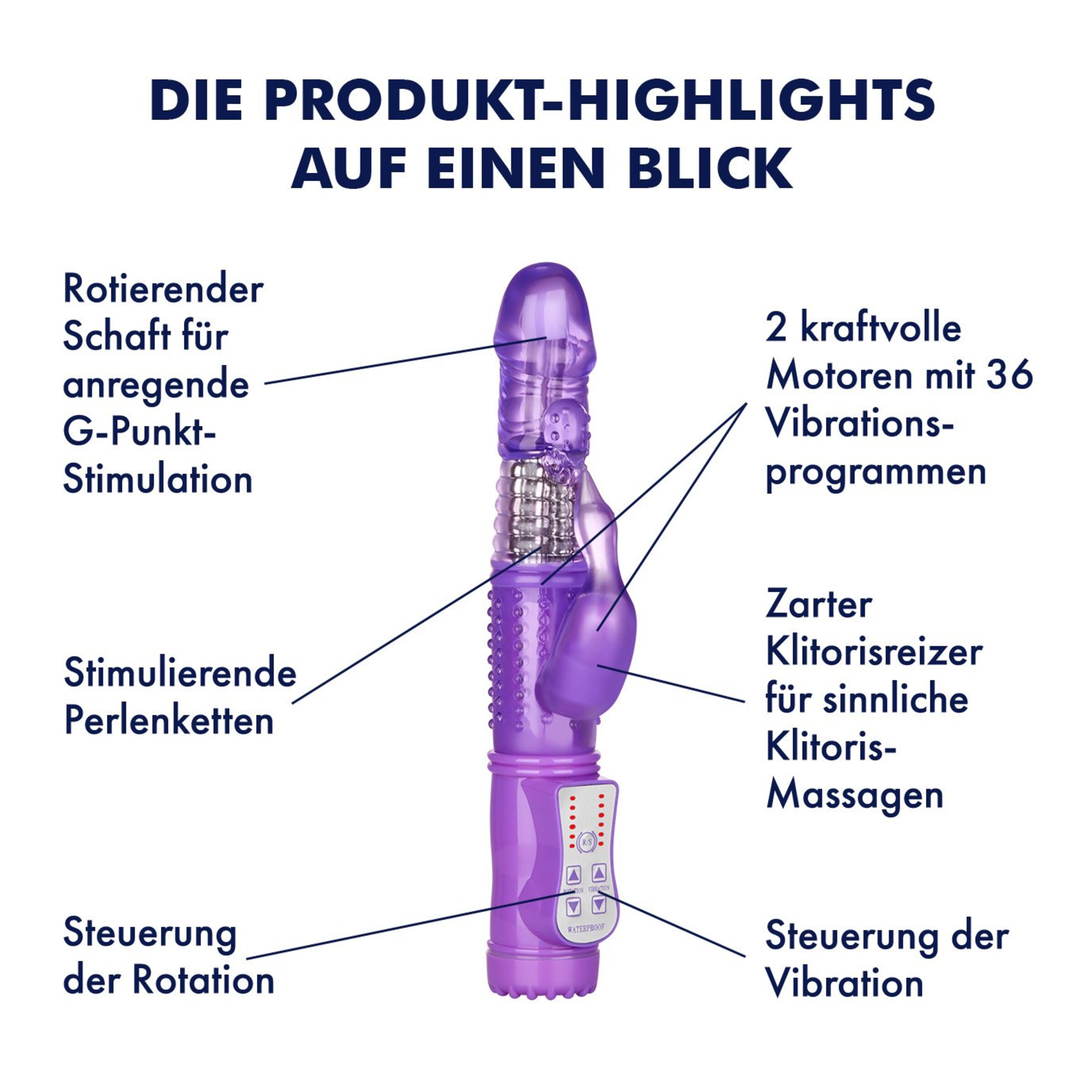 Dieser Perlenvibrator zeigt Dir wo der Hase lang läuft! Er mag süß und unschuldig aussehen mit seinen hübschen Perlen und dem Klitorisreizer in Hasenform, aber er hat es faustdick hinter den Ohren: 36 aufregende Programme sorgen für ein individuelles, befriedigendes und lustvolles Abenteuer. Er vibriert, er massiert und er rotiert - alles zu Deinem höchsten Vergnügen und mit Happy End!
