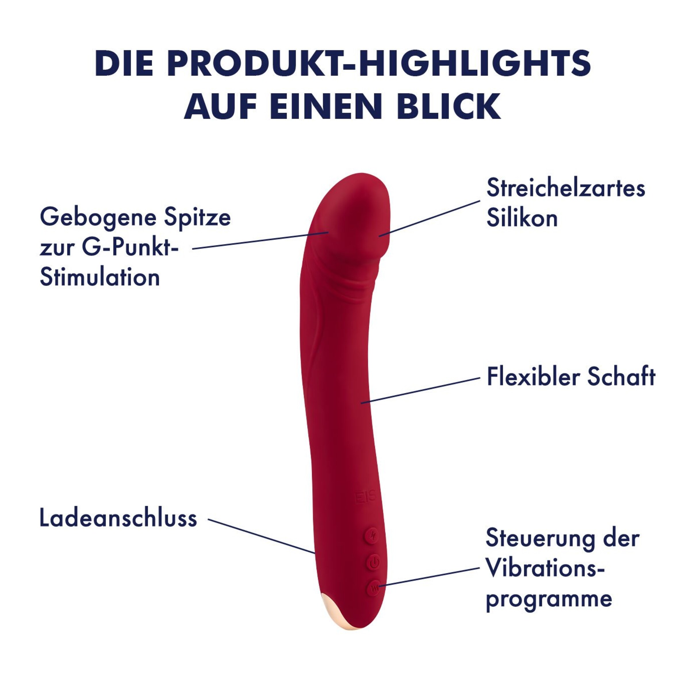 Mit dem Silikon-G-Punkt-Vibrator von EIS entdeckst Du neue Dimensionen der Lust! Mit einer Gesamtlänge von 22 cm und einer einführbaren Länge von 15 cm sorgt der flexible Schaft dafür, dass er sich perfekt an Deinen Körper anpasst. Die stilisierte, gebogene Eichel und die leicht geaderte Oberfläche stimulieren Deinen G-Punkt zielsicher und intensiv. Dank der samtig weichen Oberfläche aus Silikon und ABS Kunststoff gleitet der Vibrator sanft über Deine Haut und verwöhnt Dich bei jedem Einsatz.