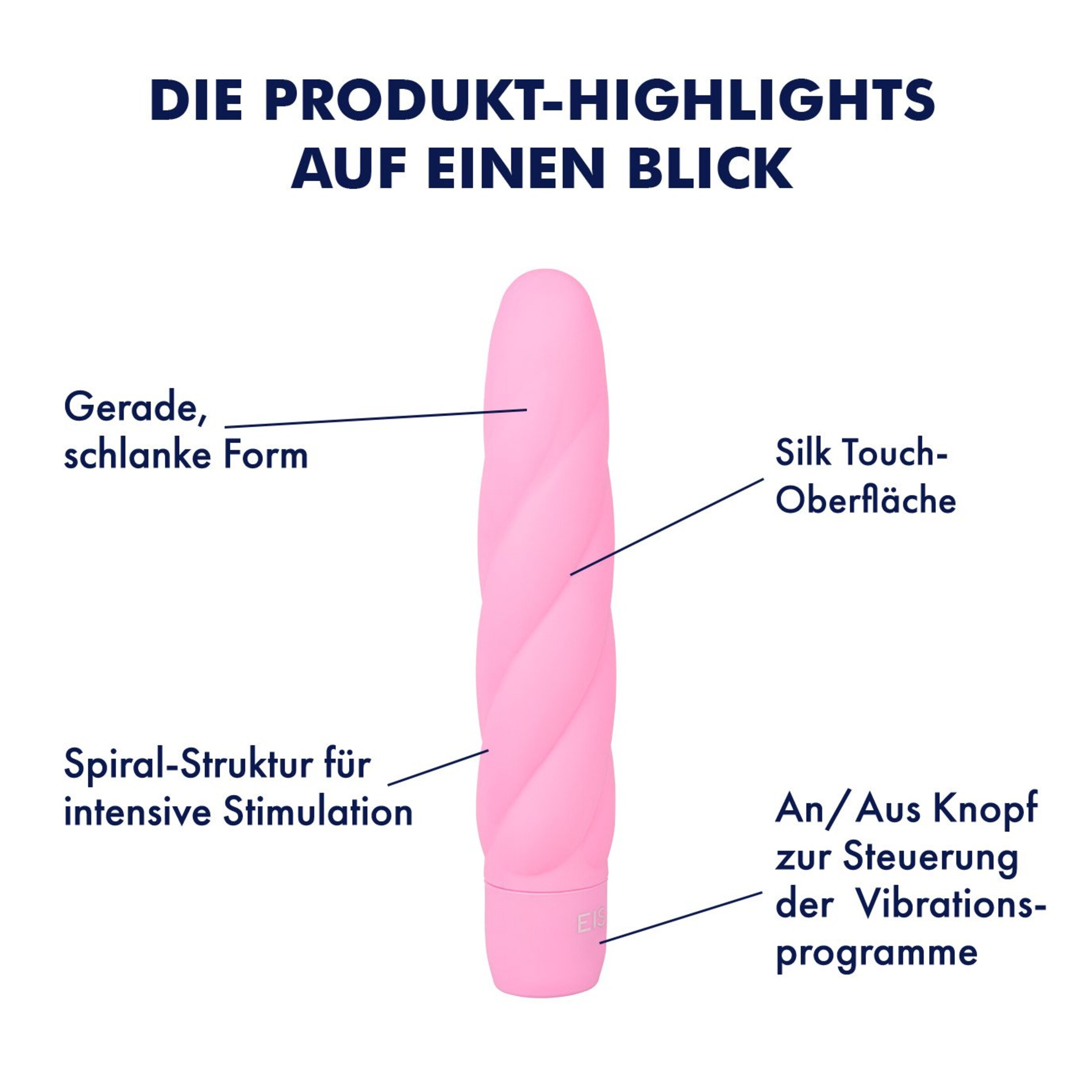 Dank seiner geraden Form dringt er tief in Dich ein und stößt in ungeahnte Zonen vor. Sein langer, gerader Schaft ist mit einer spiralförmigen Struktur versehen, die sich schwungvoll um den gesamten Vibrator legt. Er überrascht Dich mit 10 abwechslungsreichen Vibrationsprogrammen: Von sanfter Massage bis hin zur harten Pulsation ist alles dabei. So kommt jede Genießerin auf ihre Kosten.