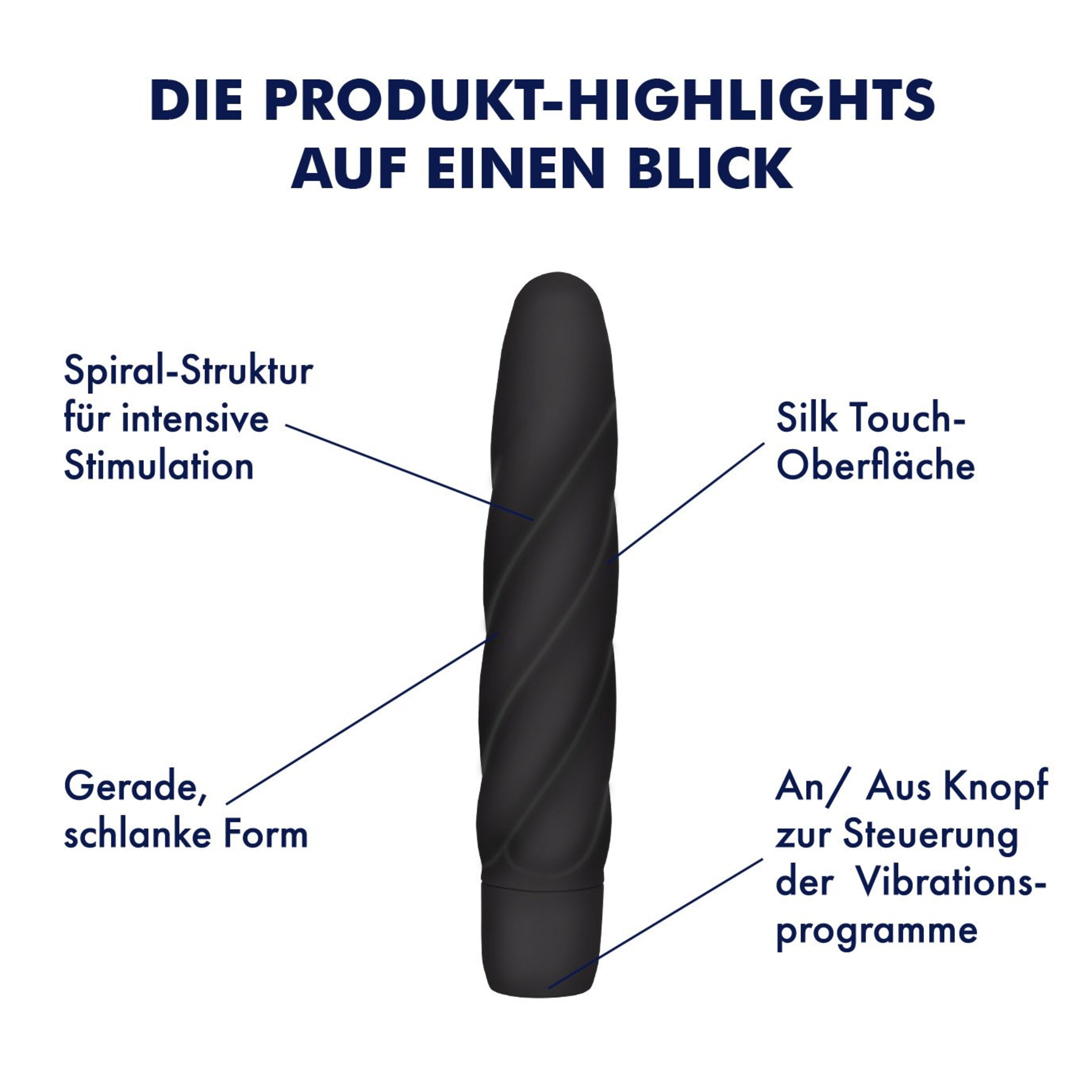 Dank seiner geraden Form dringt er tief in Dich ein und stößt in ungeahnte Zonen vor. Sein langer, gerader Schaft ist mit einer spiralförmigen Struktur versehen, die sich schwungvoll um den gesamten Vibrator legt. Wie eine süße Zuckerstange verdreht er Dir bei jedem Stoß den Kopf, sodass Du nie genug bekommst. Die samtweiche Oberfläche ist überaus gleitfreudig und mit Hilfe von etwas wasserbasiertem Gleitmittel für langanhaltenden Spaß bereit.