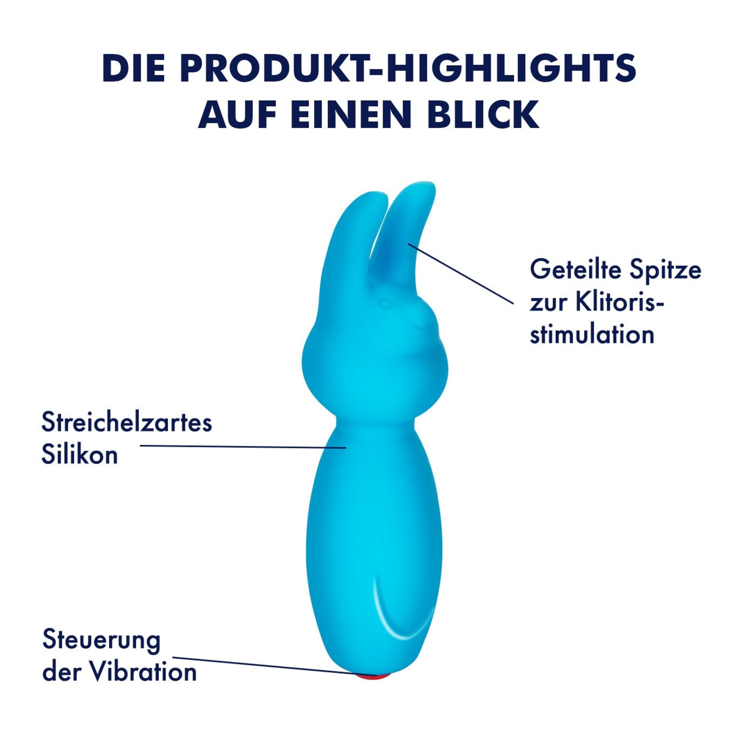 Dieser kleine, hellblaue Hase hat es faustdick zwischen den Öhrchen. Das handliche Bullet auf hautfreundlichem Silikon ist ganz im Häschen-Stil mit zwei langen, biegsamen Ohren ausgestattet. Diese werden durch die kraftvolle Vibration in intensive Schwingung versetzt und massieren damit jeden sensiblen Körperbereich.