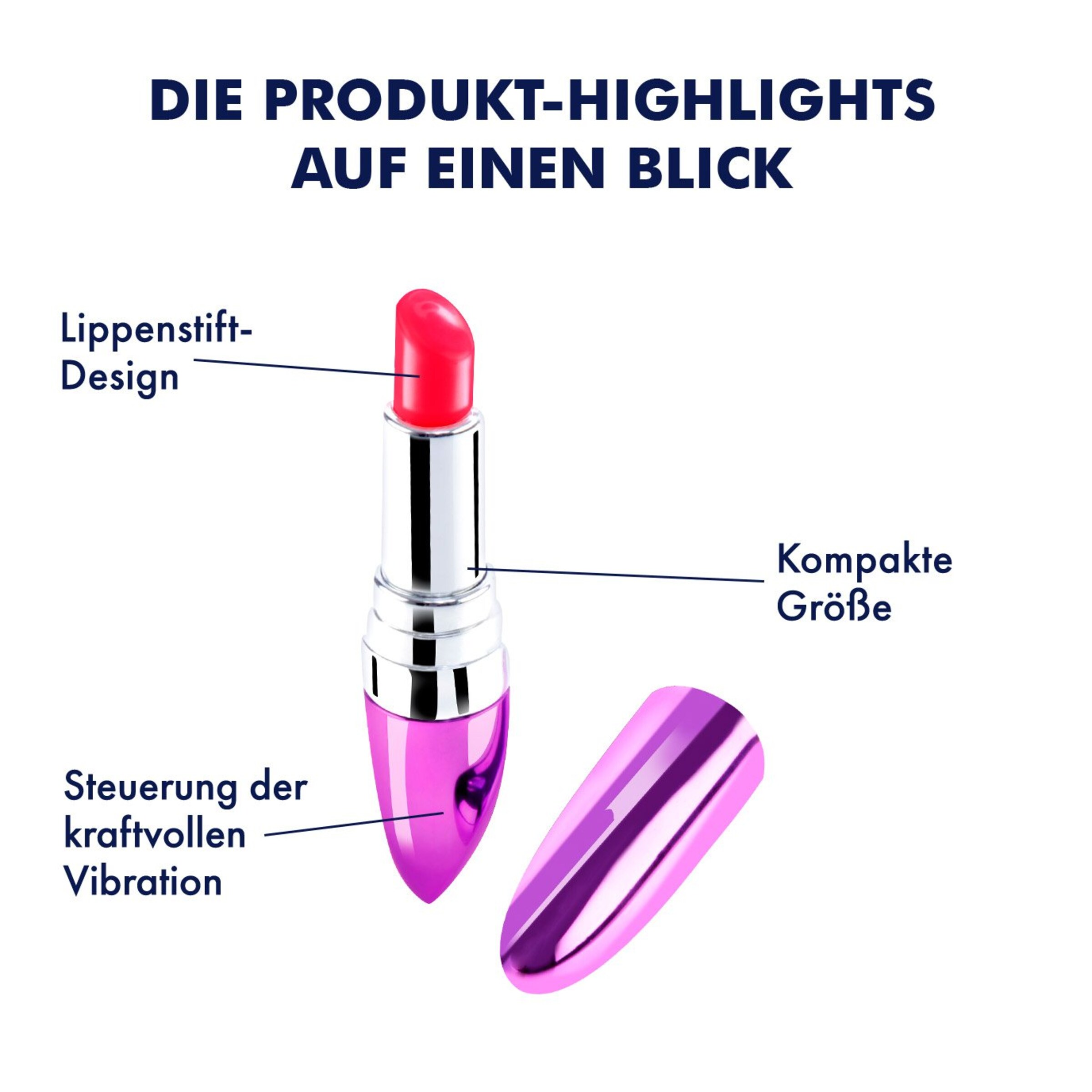 Der verspielte, rosa-metallic glänzende Lippenstift liegt in Deiner Tasche und birgt ein prickelndes Geheimnis. Denn Deine Lippen kannst Du damit garantiert nicht nachziehen. Zumindest nicht die im Gesicht. Unter seiner Kappe verbirgt sich ein kraftvoller Lippenstift-Vibrator, der ganz diskret in jede Handtasche passt. Die eindrucksvolle Vibration massieren Dich intensiv und bescheren himmlische Höhepunkte egal, wo Du Dich gerade befindest. Die Schutzkappe bietet hygienischen Schutz und gewährleistet, dass Dein kleines Geheimnis definitiv gewahrt wird.