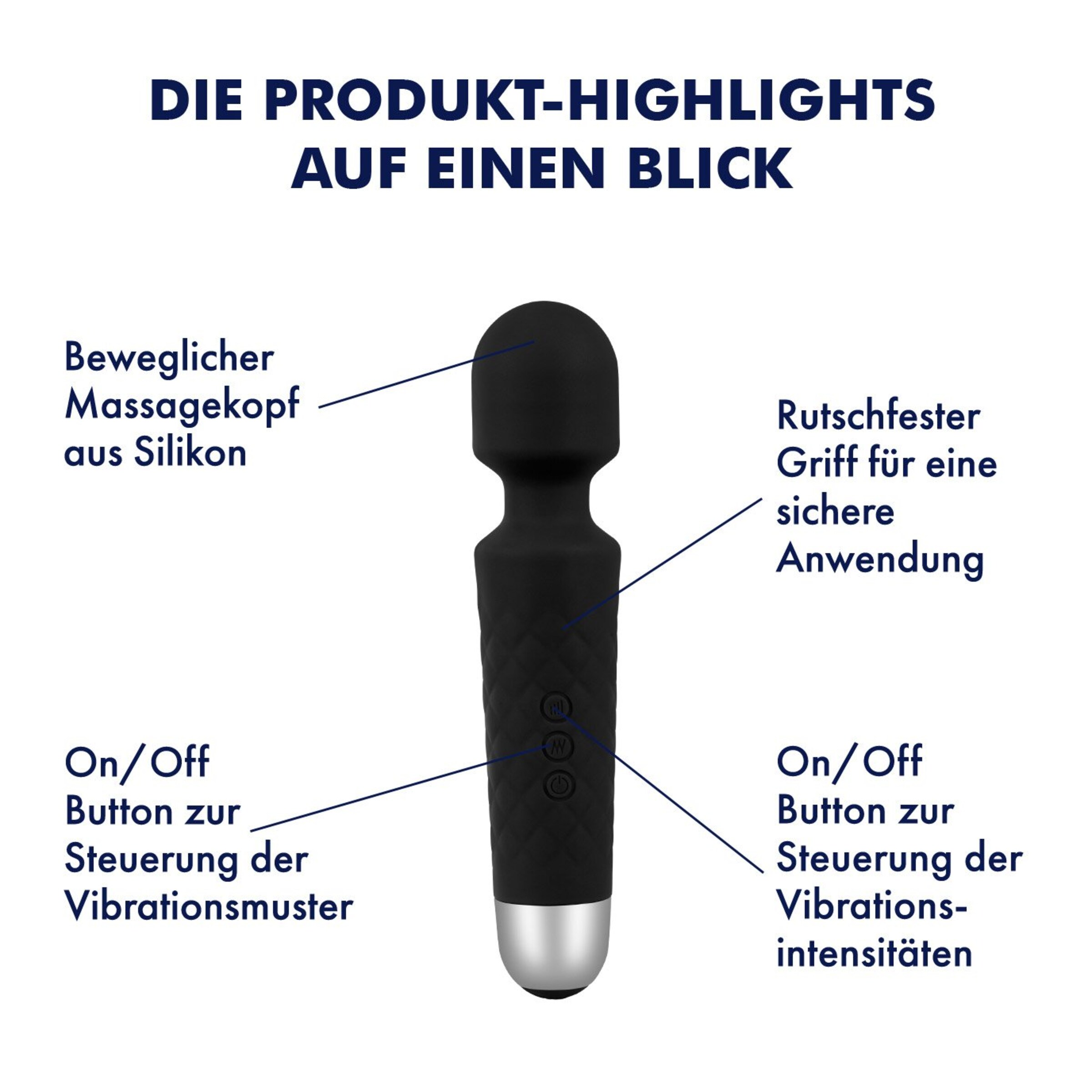Optisch springt der schwarze Massagestab sofort ins Auge: Sein elegantes, stilsicheres Design ist schlicht und doch luxuriös gehalten. Seine Oberfläche aus sanftem Silikon fühlt sich wunderbar weich an und liegt griffig in der Hand. Der kleine Mann lässt Euch nicht nur bei der Schultermassage hinwegschmelzen, sondern bringt Euch auch im Bett auf Hochtouren. Mit satten 8 verschiedenen Vibrationsstärken und 10 vielfältigen Vibrationsmustern verwöhnt er Euch nach Strich und Faden.