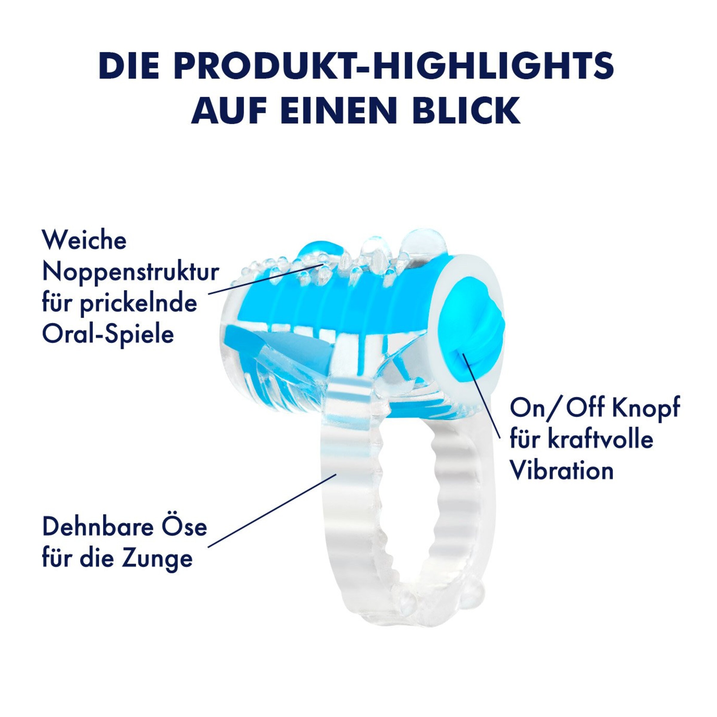 Nie waren heiße Oral-Spiele intensiver. Der kleine, handliche Zungen-Vibrator wird einfach mit der dehnbaren, weichen Öse über die Zunge gestülpt. Die zahlreichen, weichen Noppen und die kraftvolle Vibration verfeinern jeden Blowjob und machen Zungenspiele an der Klitoris noch prickelnder. Damit gelingt Dir jeder Cunnilingus spielerisch leicht. Batterien sind für sofortigen Spaß inklusive.