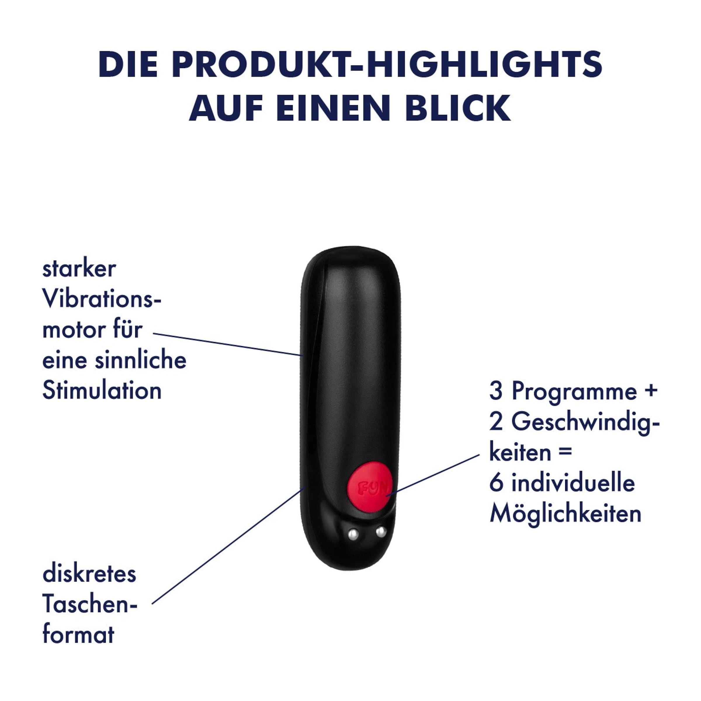 Dieser kleine Spielgefährte mag auf den ersten Blick unscheinbar wirken - berührst Du jedoch sein rotes Knöpfchen, wird er Dir schon zeigen, wo es lang geht. Mit 5 intensiven Vibrationsrhythmen massiert der Auflegevibrator Dich genau da, wo es Dir gefällt. Mit sanften Vibes oder ungestümen Impulsen treibt er Dich zum Gipfel der Lust. Du kannst Ihn über Deine Haut gleiten lassen, streicheln oder rollen. Dieses erotisierende Spiel kennt nur eine Regel: Bitte nicht einführen ohne passende Hülle, wie zum Beispiel dem Duke!