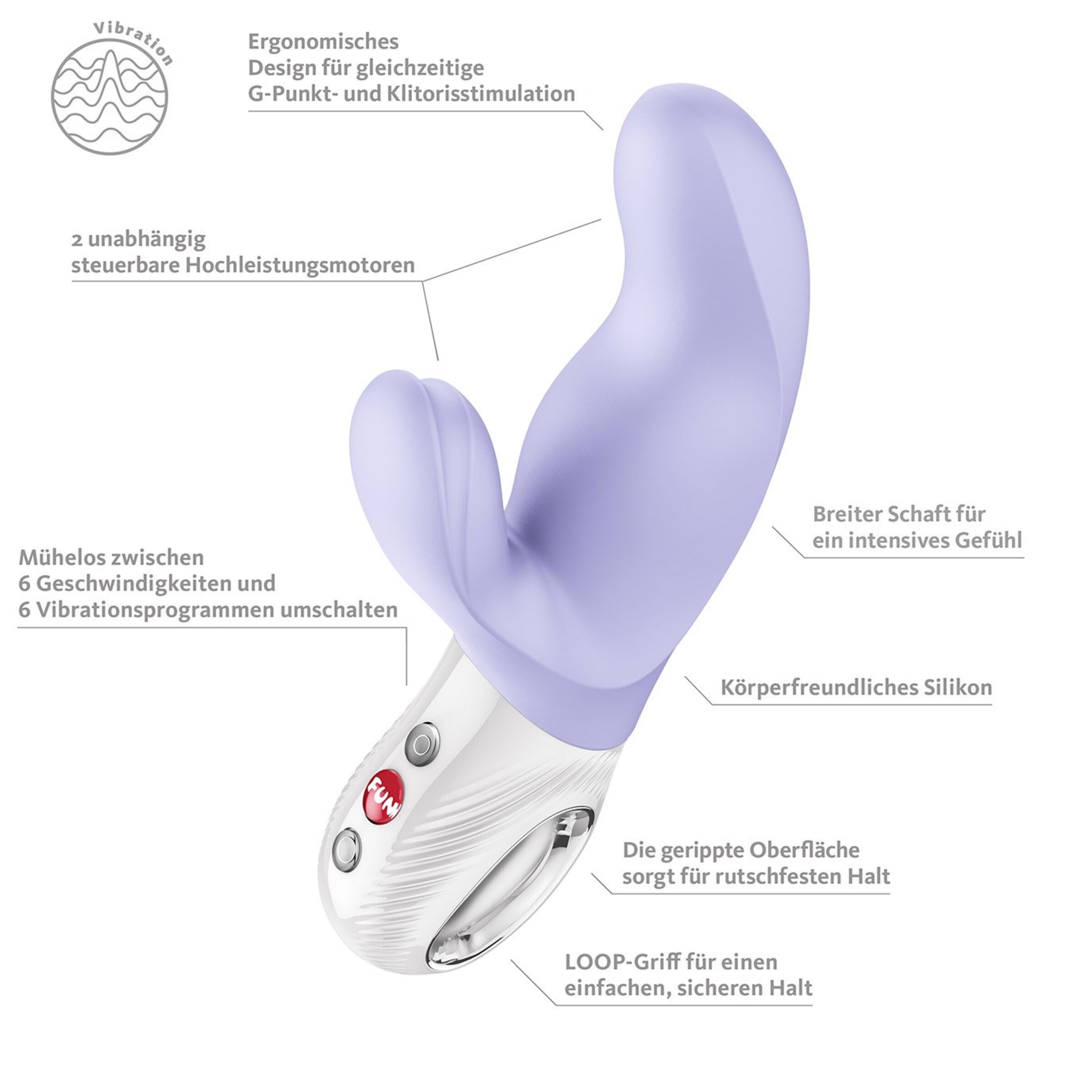 Der MISS BI ist ein kraftvoller Rabbit-Vibrator, der dir gezielte Doppelstimulation schenkt – genau dort, wo du sie willst. Ein speziell geformter Arm verwöhnt deinen Kitzler, während der flexible Schaft präzise den A-Spot massiert – den geheimen Lustpunkt direkt hinter dem G-Spot. Du willst tiefe Empfindungen ohne vollständige Penetration? Kein Problem: Der MISS BI eignet sich auch perfekt für intensive G-Spot-Stimulation.