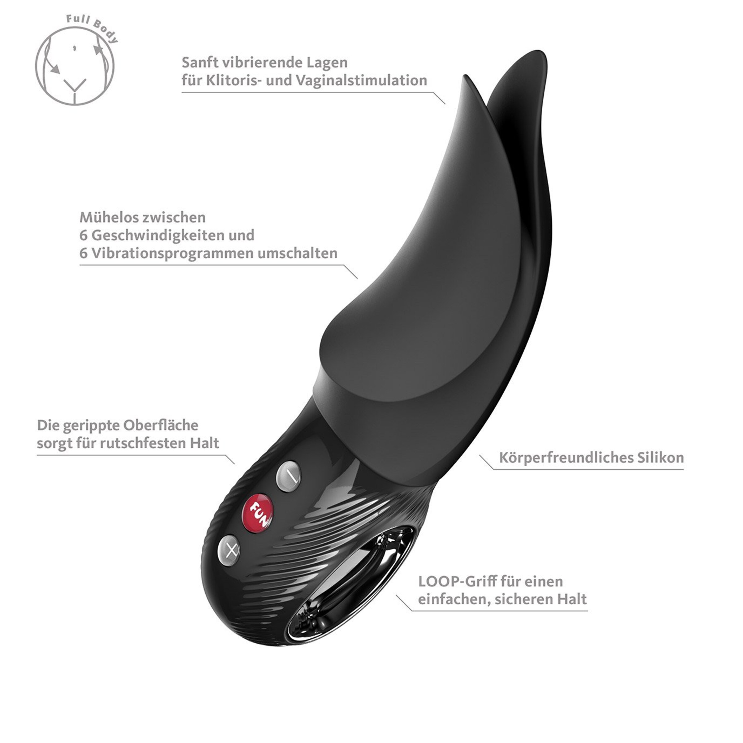 Der Lay-on-Vibrator liegt dank ergonomischem LOOP-Griff mit geriffelter, rutschfester Oberfläche jederzeit sicher in deiner Hand – auch bei nassem Spiel. 6 kraftvolle Intensitäten und 6 stimulierende Vibrationsmuster, die sich separat einstellen lassen, sorgen für unzählige Kombinationsmöglichkeiten und immer neue Höhepunkte.