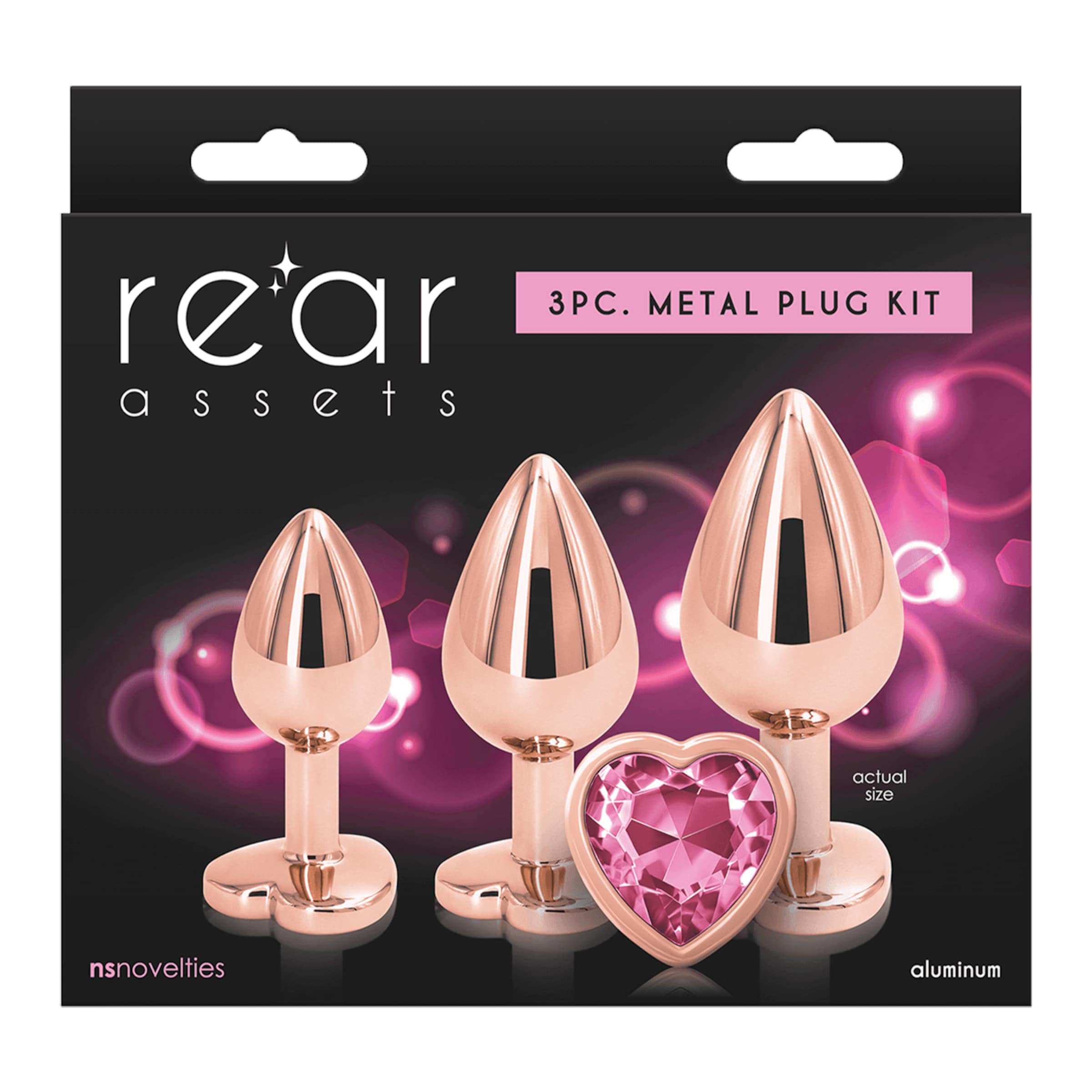 Mit dem Trainer Kit Heart aus der eleganten Rear Assets Kollektion von NS Novelties bringst Du Stil und Stimulation aufs nächste Level. Dieses funkelnde Set besteht aus drei Analplugs in abgestuften Größen – ideal, um Dich langsam und lustvoll an intensiveres Analvergnügen heranzutasten. Gefertigt aus leichtem, roségoldfarbenem Aluminium und veredelt mit einem herzförmigen Glitzerstein, sind diese Plugs nicht nur funktional, sondern auch echte Hingucker. Die Maße: 4,5 x 2,7 cm (klein), 6 x 3,4 cm (mittel) und 7,6 x 4 cm (groß) – perfekt für neugierige Anfängerinnen und aufgeschlossene Liebhaberinnen.