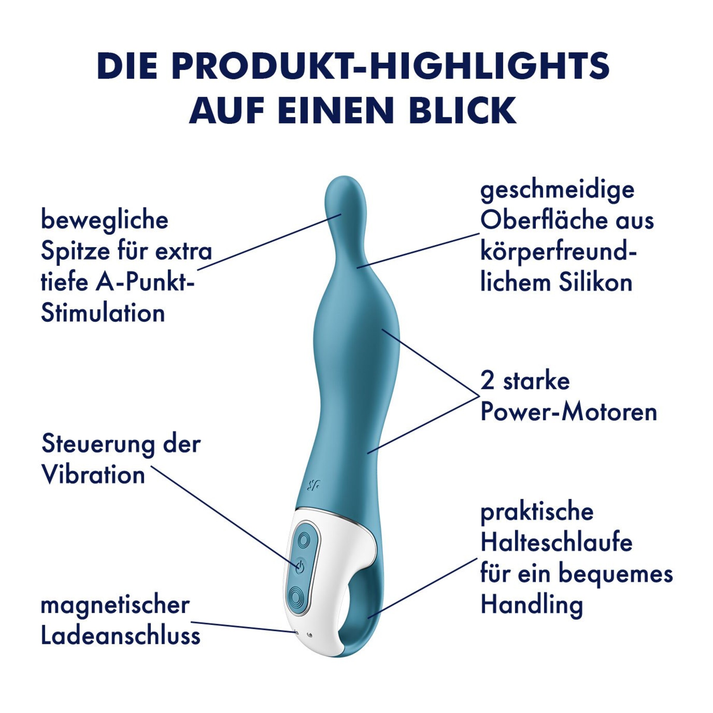 Wenn sich 'Ohhhs' und 'Uhhhs' zum A gesellen, dann kann es nur der Satisfyer A-Mazing 1 sein! Der A-Punkt-Vibrator ist ergonomisch geformt und sorgt mit der schmalen, flexiblen Spitze für extra tiefe Stimulation, die Dir den Atem rauben wird. Die A-Punkt-Stimulation ist besonders intensiv und verspricht sinnliche Höhepunkte: 2 Motoren und 12 abwechslungsreiche Vibrationsprogramme verwöhnen Deinen Hot Spot, der hinter dem G-Punkt verborgen liegt und nur darauf wartet, stimuliert zu werden. Die Vibrationsintensitäten reichen von sanft bis intensiv und lassen sich über das intuitive Bedienfeld einfach steuern, während Du dank des praktischen Halterings alles im Griff hast - selbst in den Momenten, in denen es mal wilder zugeht.