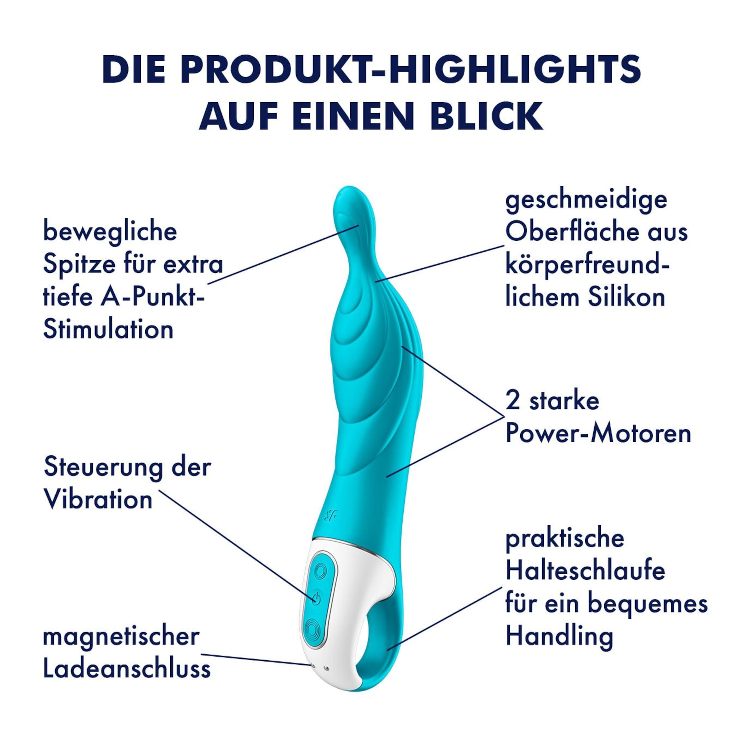 Der G-Punkt genießt Kultstatus wie Britney Spears oder die Backstreet Boys - aber Du bist auf der Suche nach dem hottestens Newcomer am Hot Spot-Himmel? Dann stellen wir Dir gerne den Satisfyer A-Mazing 2 vor, der Deinen A-Punkt mit 2 kraftvollen Motoren und intensiven Vibes verwöhnt - für extra tiefe Stimulation, wie Du sie noch nie erlebt hast! Der ergonomisch geschwungene Schaft mit gerillter Struktur liegt mit der flexiblen Spitze direkt auf und versetzt Dich mit 12 abwechslungsreichen Vibrationsprogrammen, die sich über das Bedienfeld easy steuern lassen, ordentlich in Wallung.
