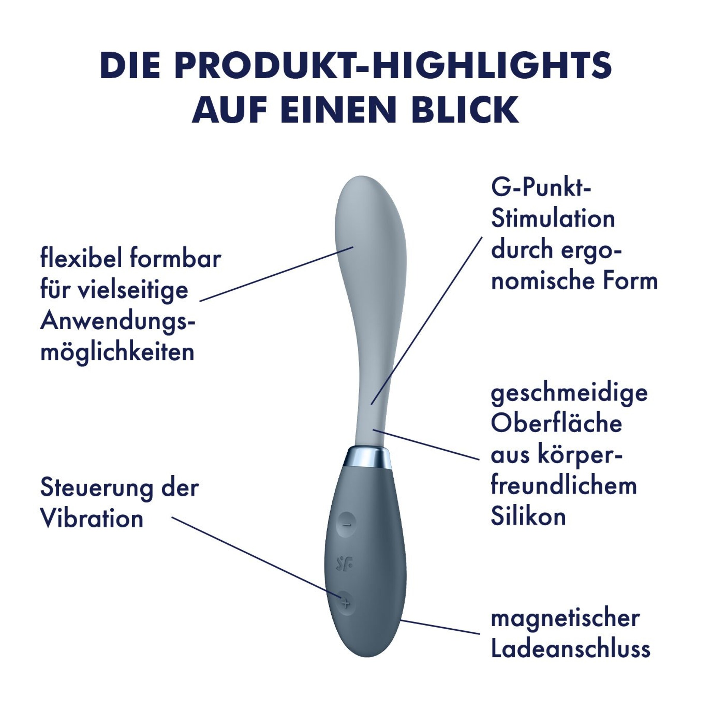 Ein Vibrator ist Dir nicht genug? Mit dem Satisfyer G-Spot Flex 3 hältst Du das Beste aus mehreren Welten in Deiner Hand. Durch seine geschwungene, anpassbare Form erreichst Du bequem Deinen G-Punkt. Dank des innenliegenden Drahts verwandelt sich der G-Punkt-Vibrator kurzerhand in einen Rabbitvibrator - für gleichzeitige Stimulation von Klitoris und G-Punkt. Das verspielte Toy beglückt Dich mit einem voluminösen Schaft und 12 kraftvollen Vibrationen, die Deinen gesamten Liebesgarten leise erzittern lassen.