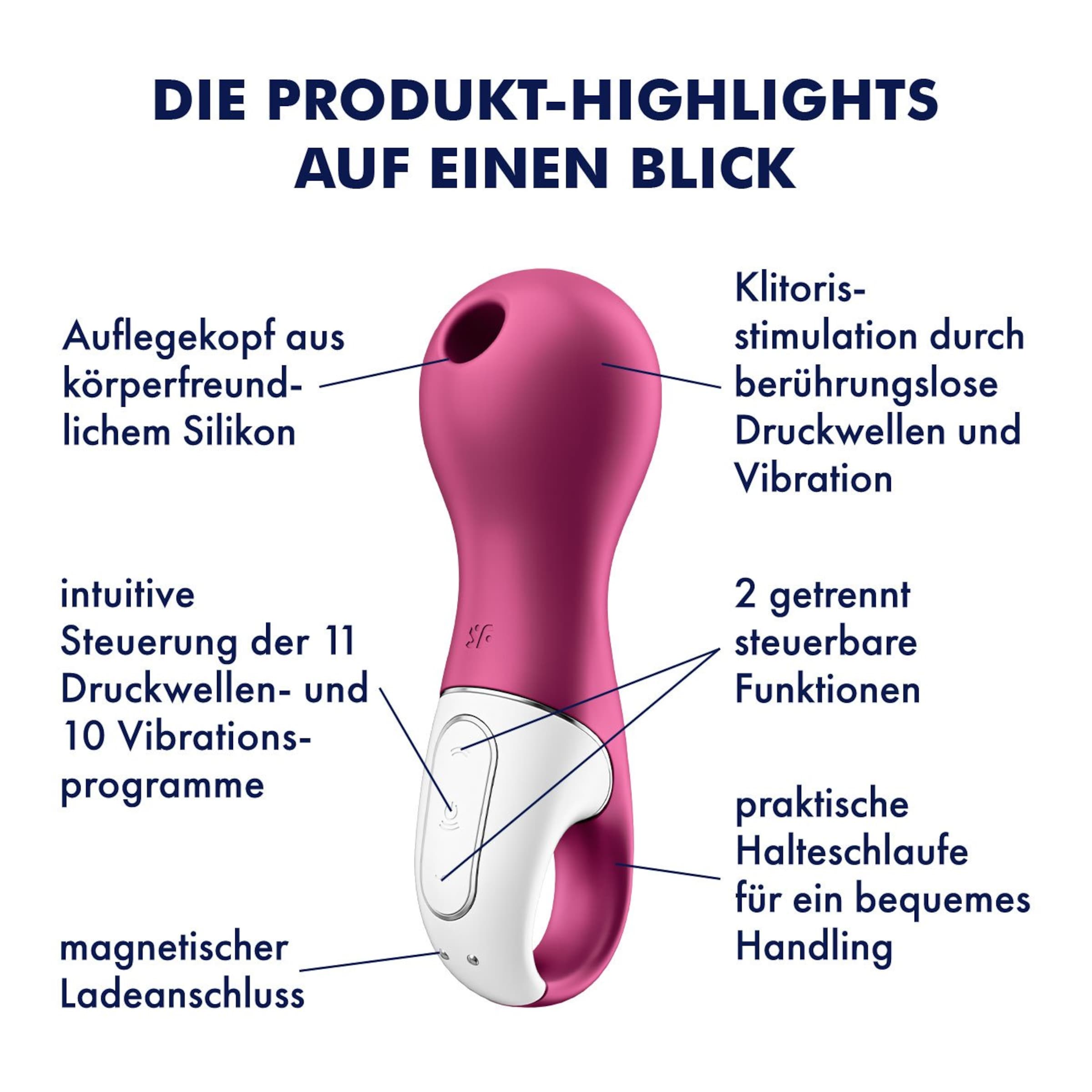 Mit seinem festen Körper schmiegt sich der Lucky Libra an Deine Klitoris und verwöhnt Deinen Hot Spot gezielt mit heißen Druckwellen und tiefgehenden Vibrationen. 11 Druckwellenintensitäten und 10 Vibrationsprogramme, die sich unabhängig voneinander steuern lassen, sorgen dabei für unzählige Kombinationsmöglichkeiten und regelmäßige Abwechslung. Damit Du in besonders leidenschaftlichen Momenten auch nicht den Halt verlierst, ist dieser Satisfyer Druckwellenvibrator mit einem praktischen Haltering ausgestattet.