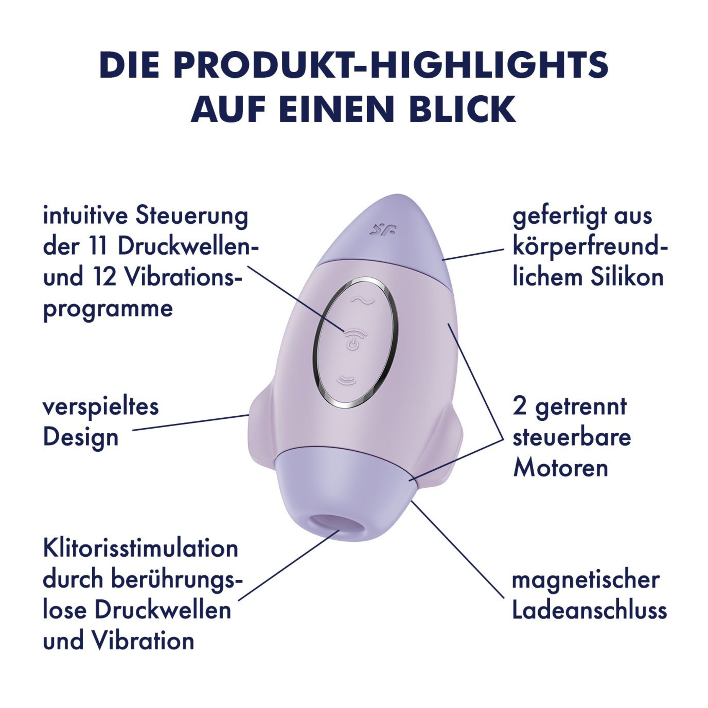 Die Mission ist gestartet! Das Ziel: Deine Klitoris – und der Planet Orgasmus. Dieser kleine Satisfyer-Vibrator in verspieltem Design ist das perfekte Lovetoy für Neulinge, die die weltweit heißgeliebte Satisfyer Air Pulse Technologie kennenlernen möchten. 11 Druckwellenintensitäten, die sich ganz leicht und intuitiv über die Buttons auf der Vorderseite steuern lassen, verwöhnen Deinen kleinen Lustplaneten vollkommen berührungslos.