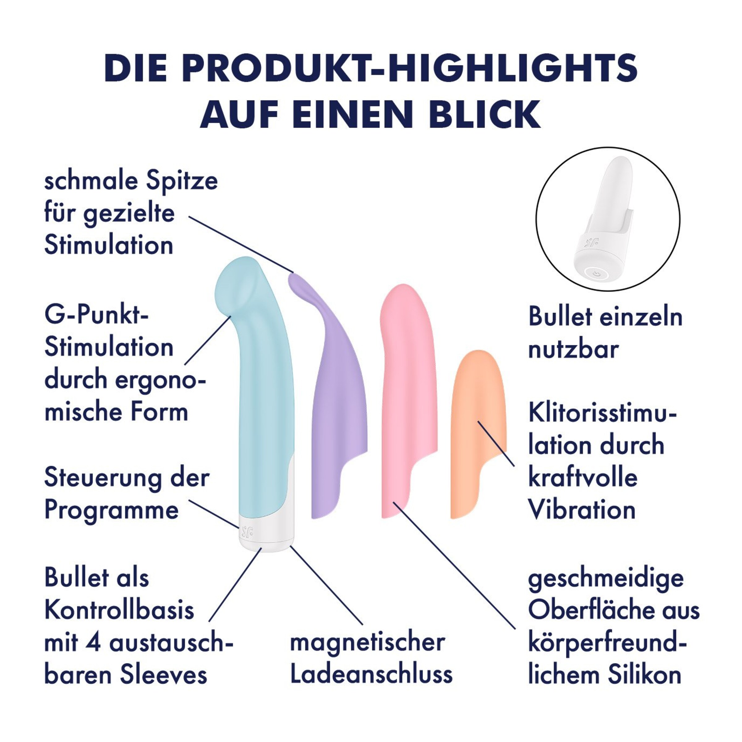 Der G-Punkt-Vibrator mit flacher Spitze und gebogener Form eignet sich perfekt für die großflächige Stimulation Deines innenliegenden Hotspots. Mit dem kleinen Lay-on verwöhnst Du Deine Klitoris mit intensiven Vibrationen. Der klassische Vibrator-Sleeve bietet Dir beides: Leicht gekrümmt kannst Du ihn für die G-Punkt-Stimulation verwenden oder ihn außen auf Deine Klitoris legen – ganz wie Du magst. Der Tip-Vibrator mit schmaler Spitze eignet sich perfekt für gezielte Streicheleinheiten an verschiedenen Hotspots.