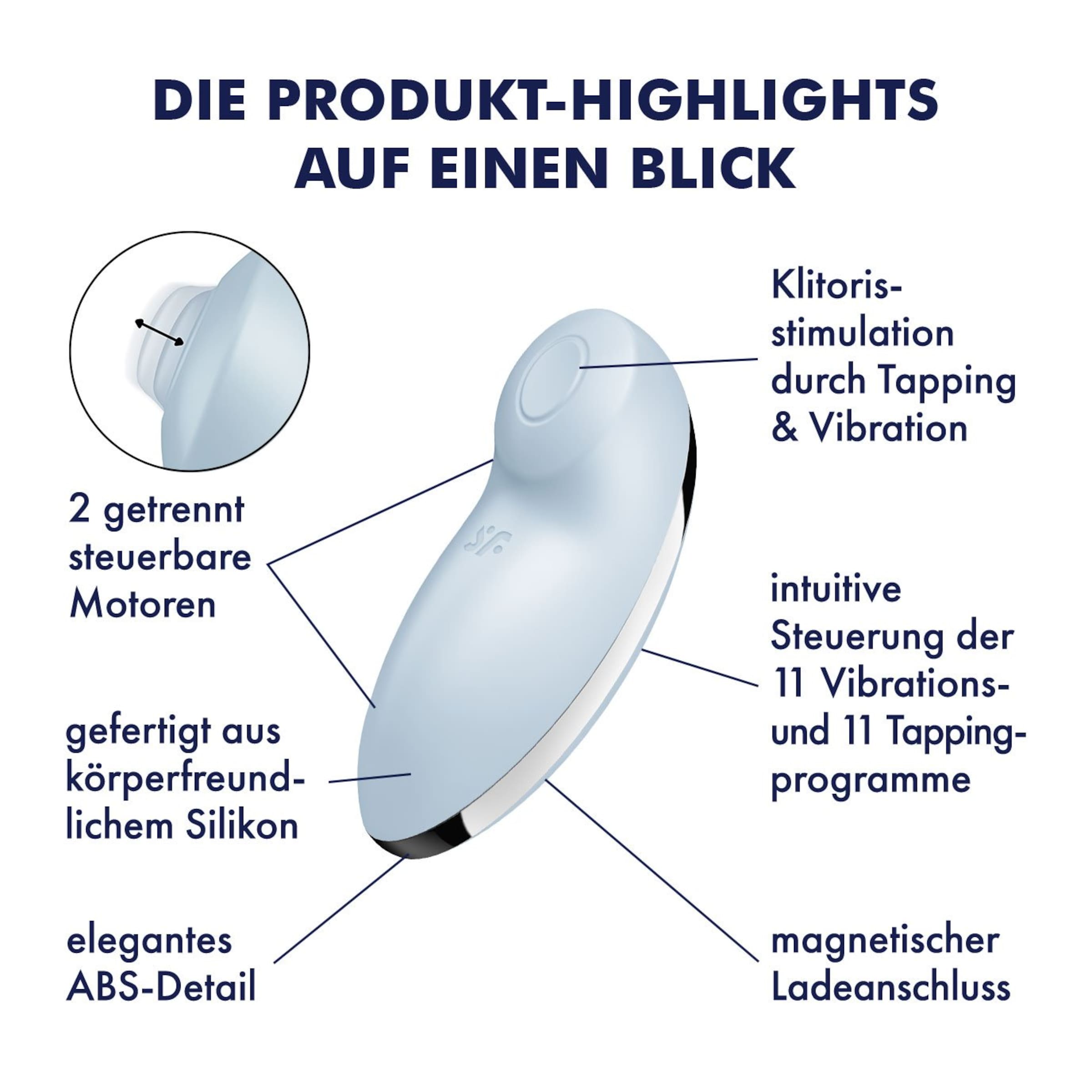 Die Oberfläche des Satisfyer Tap & Climax 2 besteht aus weichem Silikon, das sich sanft an Deine Hotspots anschmiegt und außerdem sehr leicht zu reinigen ist. Du möchtest auch unter Wasser den Morsecode für Orgasmus an Deine Klitoris senden? Kein Problem, denn dieser Auflegevibrator ist wasserdicht (IPX7) verarbeitet und kommt daher auch gern mit unter die Dusche oder in die Badewanne. Nach seinem Einsatz kannst Du den Satisfyer Tap & Climax 2 dank wiederaufladbarem Akku und dazugehörigem USB-Ladekabel ganz easy wiederaufladen.