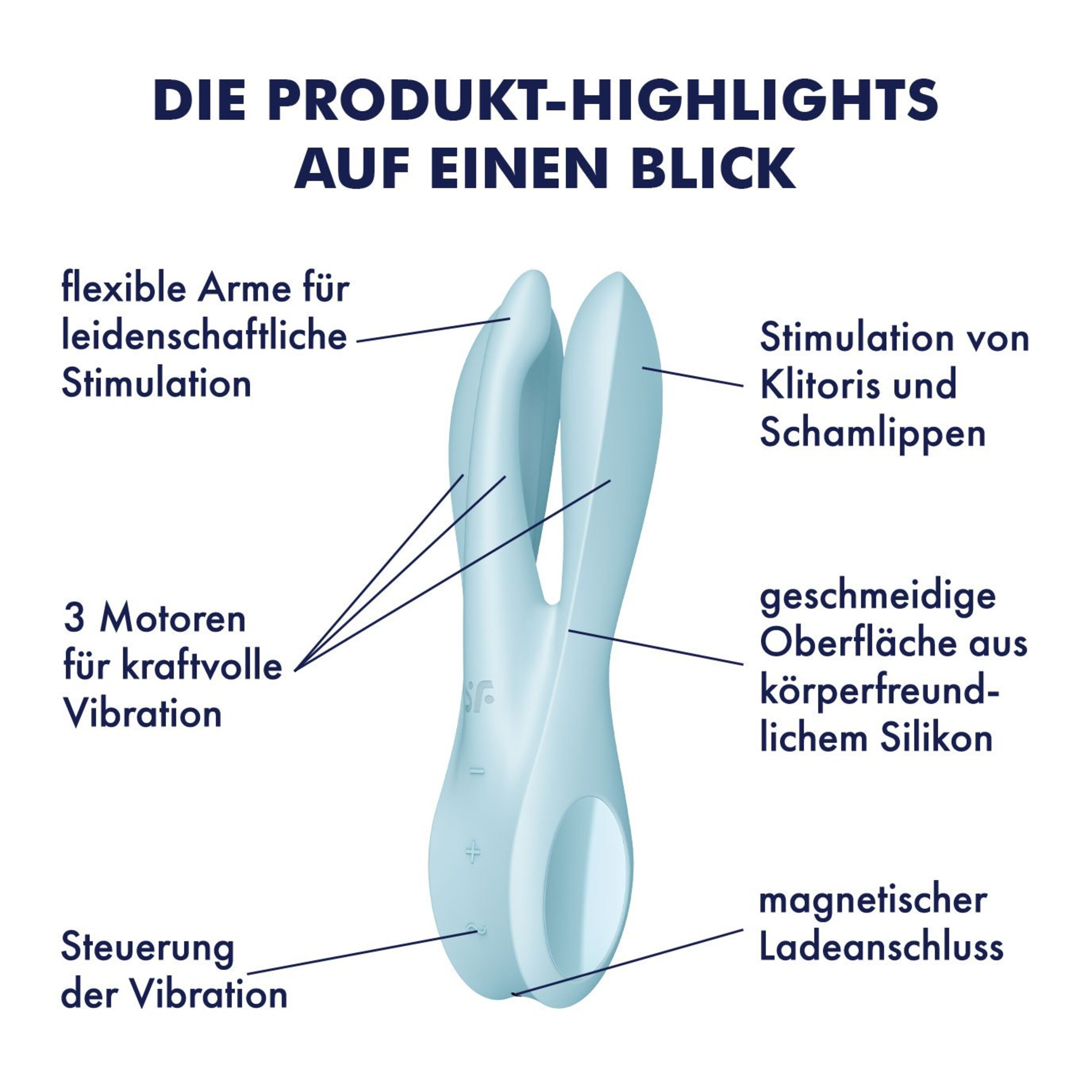 Ménage à trois mit Dir allein? Kein Problem mit dem Satisfyer Threesome 1! Der Auflegevibrator ist genauso sexy wie er aussieht und gönnt Dir die Aufmerksamkeit, die Du verdienst. Der Threesome 1 kommt mit drei flexiblen Armen daher, in denen sich jeweils ein kraftvoller Motor verbirgt. Die Arme passen sich perfekt Deinem Körper an und stimulieren mehrere erogene Zonen gleichzeitig: So liegen die beiden äußeren Arme sinnlich auf Deinen Schamlippen auf, während der schmale, mittlere Arm Deine Klitoris verwöhnt und für intensivierte Stimulation heruntergedrückt werden kann. Der Auflegevibrator versüßt Deine Solotime mit noch intensiveren und tieferen Vibrationen, die Dich zielsicher Richtung Höhepunkt massieren. Auch optisch ist er ein wahres Schmankerl: Das elegante Design wird durch seitliche Highlights abgerundet.