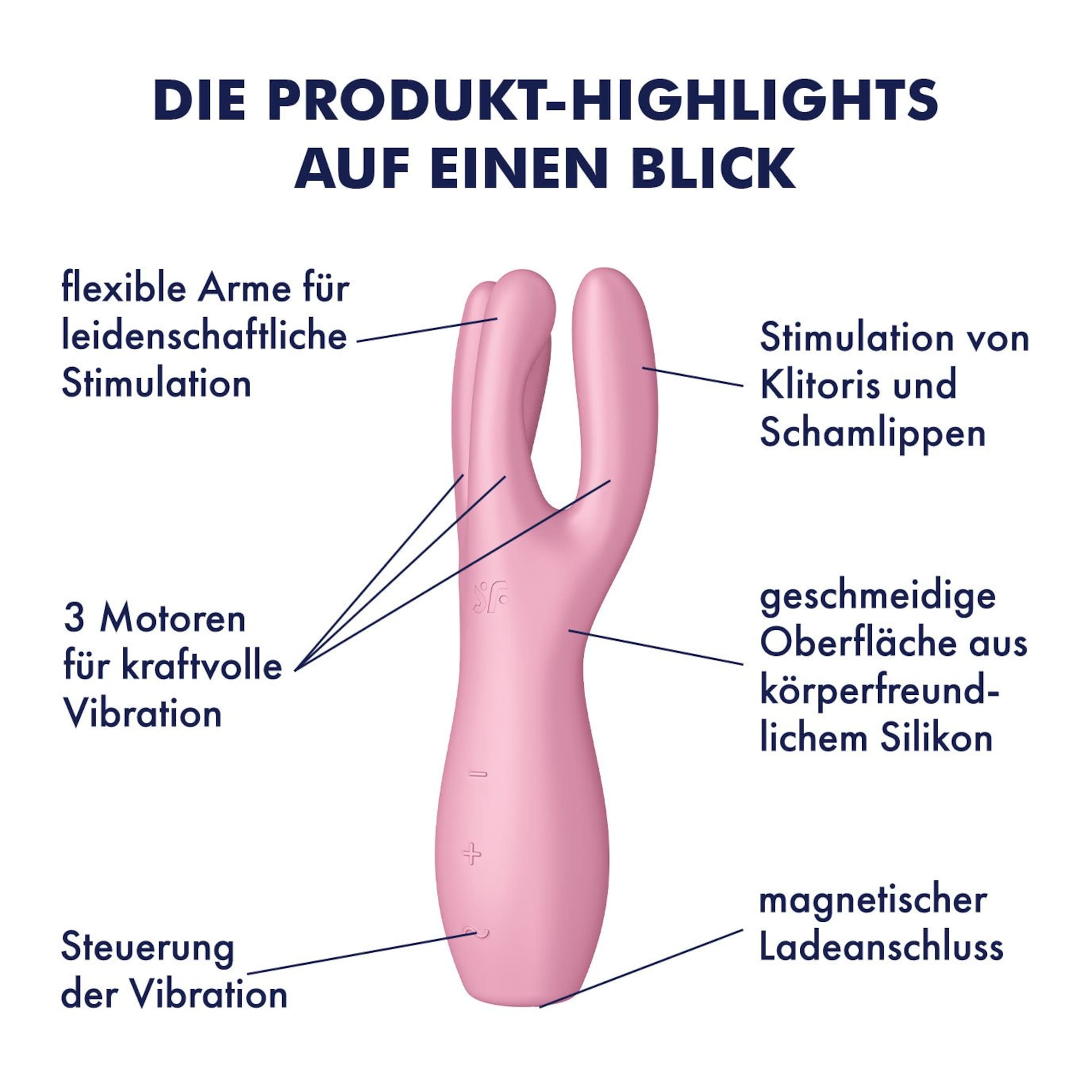 Dieser Dreier bringt ohne Reue Schwung in Dein Liebesleben: Der Satisfyer Threesome 3 hat drei Arme, viel Power und zaubert Dir mit seinen intensiven Vibrationen rosige Wangen – wann immer Du willst!