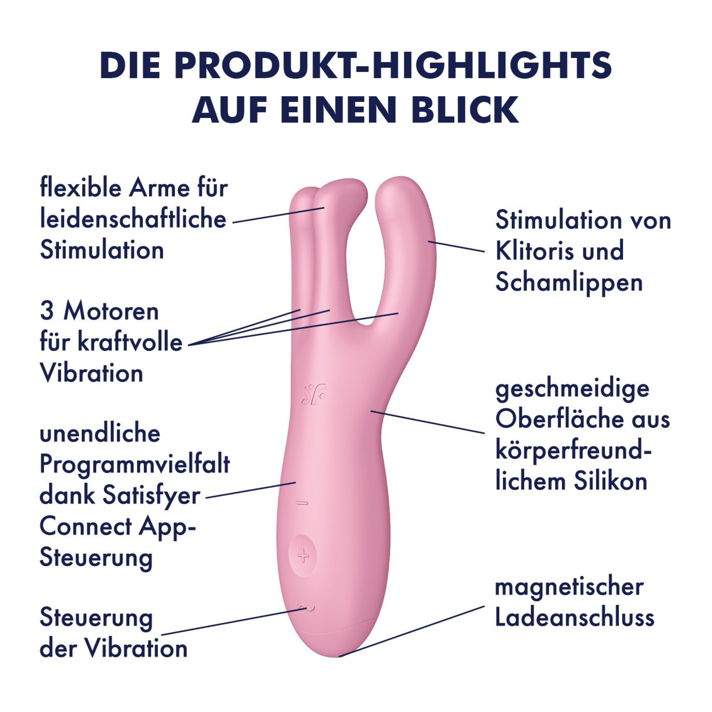 Du möchtest gleich dreifach verwöhnt werden? Der Satisfyer Threesome 4 ist ein Auflegevibrator, der Dir diesen absolut nachvollziehbaren Wunsch erfüllt. Wie er das macht? Mit seiner dreifachen Power natürlich!