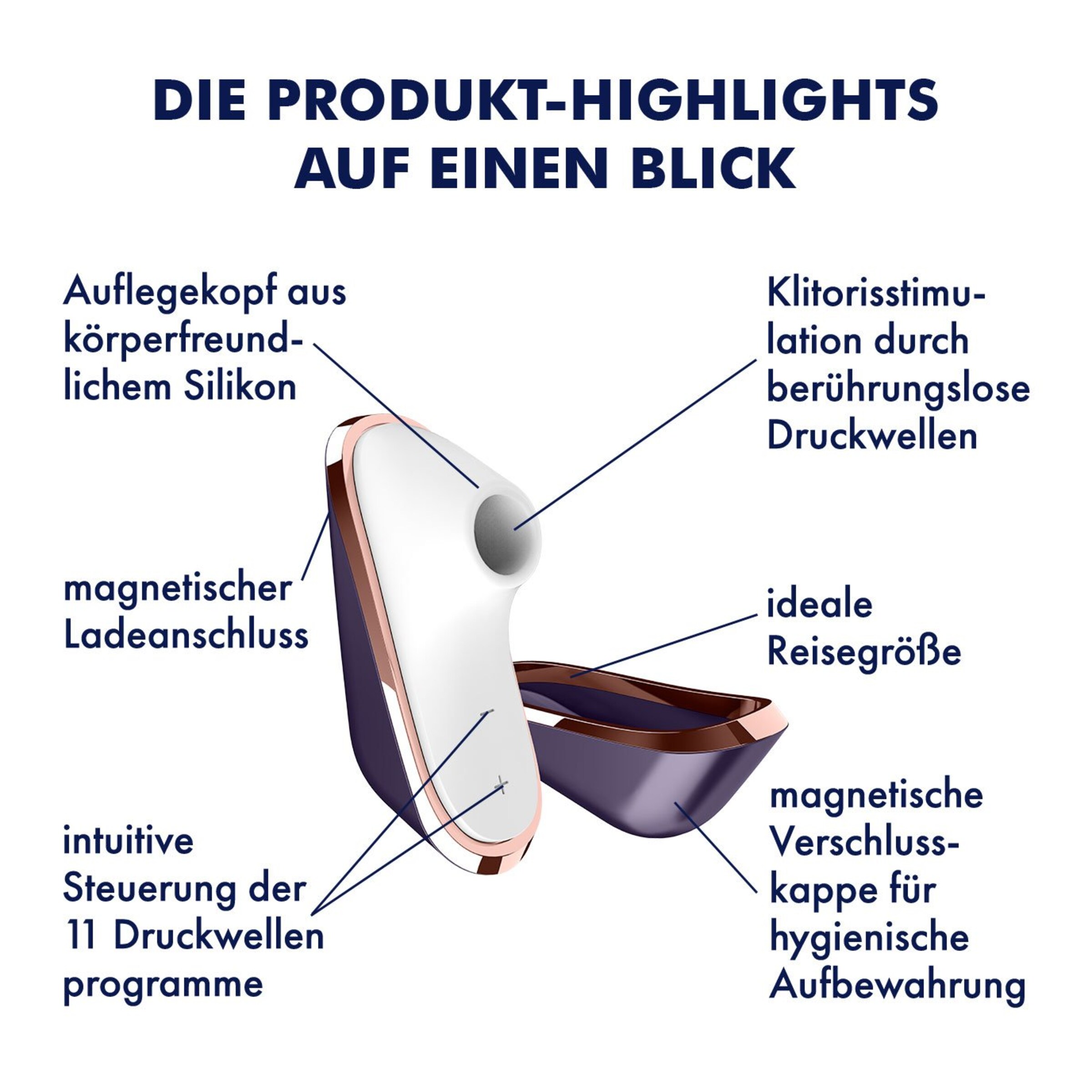 Satisfyer - viel mehr als eine deutsche Marke! Alles begann mit der berührungslosen Stimulation der Klitoris dank innovativer und patentierter Druckwellentechnologie - mittlerweile bereichert die weltweit führende Sexual Wellness Marke das Liebesleben von weit über 25.000.000 Millionen Frauen, Männern und Paaren in über 100 Ländern mit einem vielfältigen Produktsortiment sowie stets neuen Ideen und modernsten Technologien. Mit Qualitätsmerkmalen wie hochwertigem Silikon, 15 Jahren Garantie, wasserdichter (IPX7) Verarbeitung und leistungsstarken Motoren ist die deutsche Erfolgsmarke stets darauf bedacht, in ihren Produkten Technologie mit außergewöhnlichem Design zu verbinden. Alleine in den letzten Jahren hat es Satisfyer wie keine andere Firma geschafft über 474 internationale Design-Awards zu gewinnen. Darunter gleich 73x den Red Dot und 19x den IF Design Award.