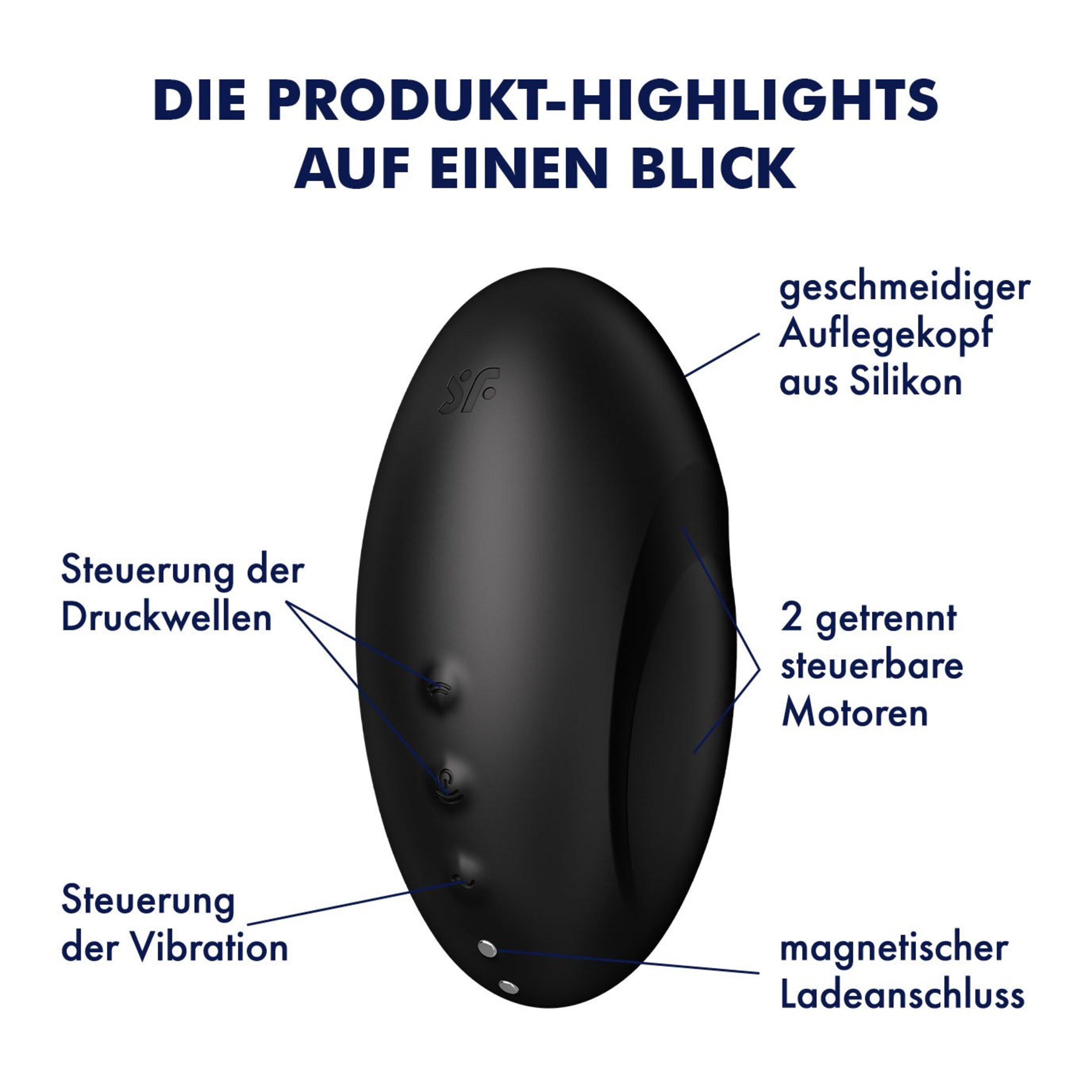 Der Satisfyer Vulva Lover 3 ist außerdem großartig für alle mit keiner bis wenig Erfahrung in Sachen Vibratoren und eignet sich ideal zum Ausprobieren: Er bietet sowohl die klassische Art der Vibration als auch die begehrte Air Pulse-Technologie: Druckwellen bringen Deine Klitoris berührungslos in Wallung. Seine 2 Motoren sind getrennt voneinander steuerbar und geben Dir so die Möglichkeit, die perfekte Balance beider Funktionen zu finden. 11 Druckwellen- und 10 Vibrationsprogramme schenken Dir hierfür eine Menge sinnlicher Kombinationen.