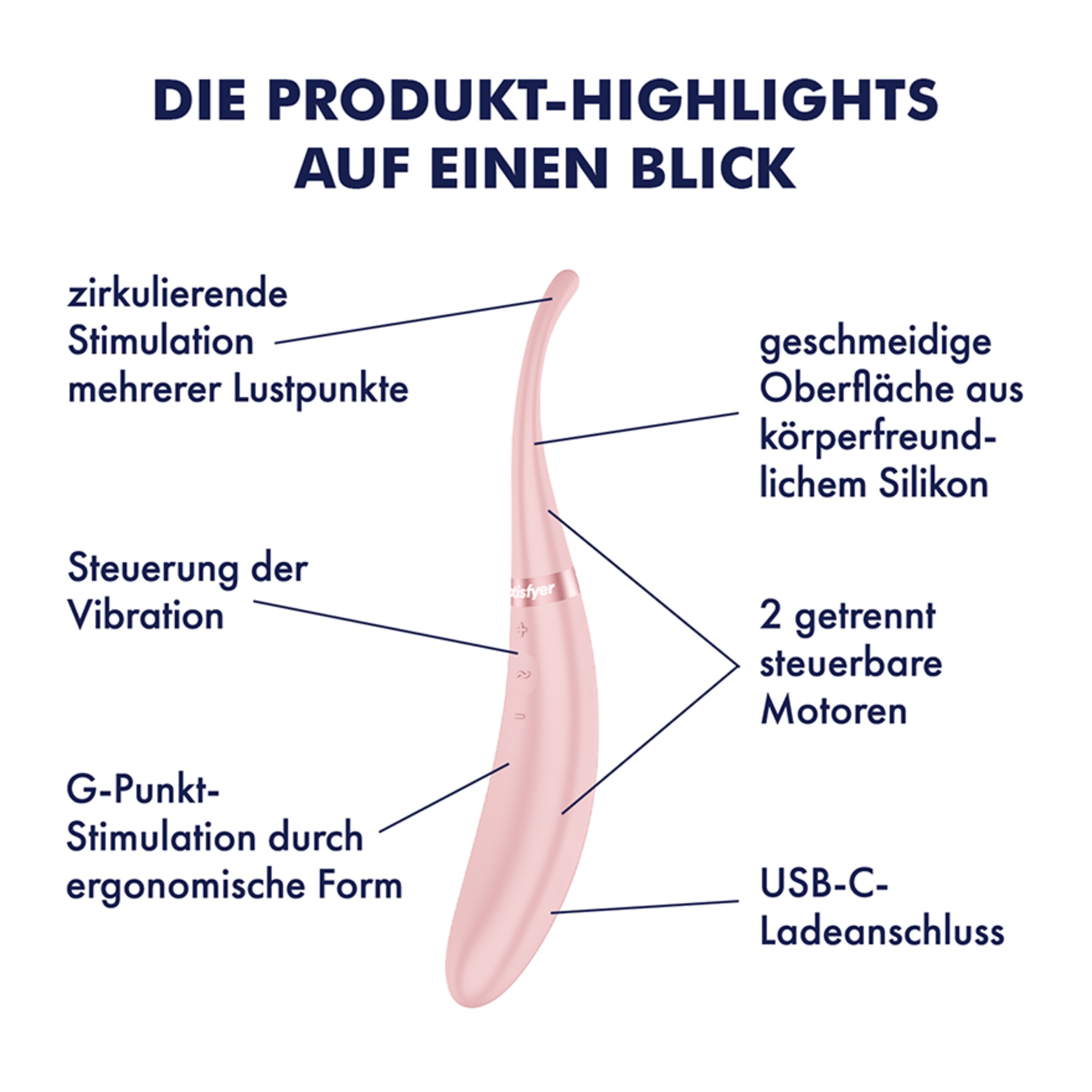 Der Satisfyer Tip Tease bringt ordentlich Rotation in Deine Me-Time! Seine zirkulierende Pleasure-Spitze reizt und verwöhnt Dich mit punktgenauer Präzision – perfekt, um Deine erogenen Zonen zum Zittern zu bringen. Du stehst mehr auf G-Punkt-Stimulation? Kein Problem, denn die andere Seite des Lovetoys lässt sich easy einführen und verwöhnt Deinen inneren Sweet Spot mit intensiven Vibrationen.